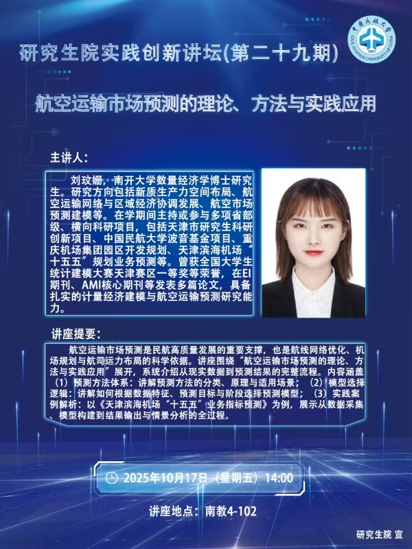 刘玟姗,南开大学数量经济学博士研究生。研究方向包括新质生产力空间布局、航空运输网络与区域经济协调发展、航空市场预测建模等。在学期间主持或参与多项省部级、横向科研项目,包括天津市研究生科研创新项目、中国民航大学波音基金项目、重庆机场集团园区开发规划、天津滨海机场“十五五”规划业务预测等。曾获全国大学生统计建模大赛天津赛区一等奖等荣誉,在EI期刊、AMI核心期刊等发表多篇论文,具备扎实的计量经济建模与航空运输预测研究能力。