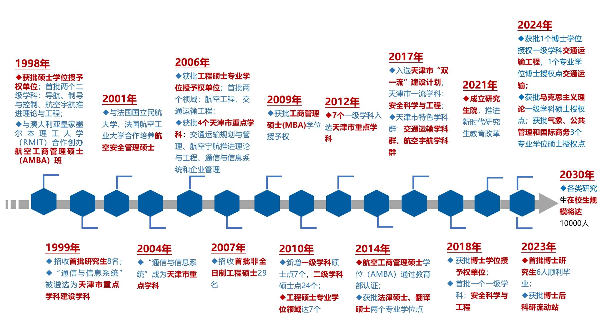 中国民航大学研究生教育始于1999年,最初在“导航、制导与控制”和“航空宇航推进理论与工程”两个二级学科硕士点开始研究生培养。