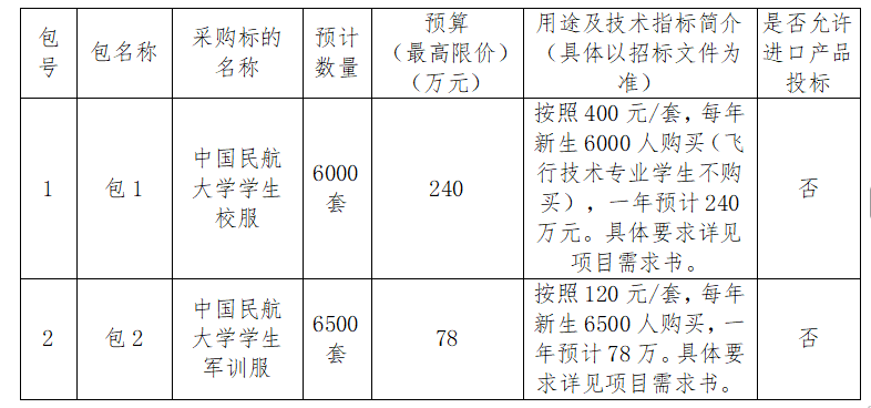 本次招标为中国民航大学2025年学生校服、军训服采购项目,共2个包,预算金额:318万元(其中:包1最高限价240万元,包2最高限价78万元)。包1中国民航大学学生校服预计数量6000套,包2中国民航大学学生军训服预计数量6500套。