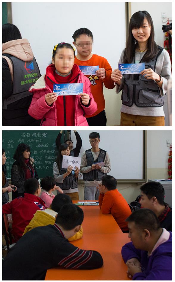 “我想去旅行”、“我想做老师”、“我想做收银员”……对于孩子们的想法,大学生记者团做了充足的准备。虽然不能真的带孩子们去远行,但是大学生记者团自制了精美的仿真机票,带领启智学校的孩子们模拟登机过程,并为他们讲解各地特色。同时,大学生记者团准备了贴着价签的商品,计算器,模拟钱币等道具,让孩子们体验收银员,体验自主购物的乐趣。孩子们的参与度都很高:一对双胞胎告诉其他人要自觉排队;“收银员”收完银后振臂高呼:“大功告成啦!”;甚至有一个孩子在志愿者的手上印下一个吻……