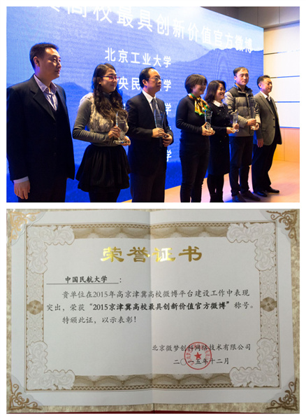 内容提要:12月20日,中国民航大学及其它33所高校组成京津冀高校新媒体联盟,学校官方微博荣获“2015京津冀高校最具创新价值官方微博”称号。