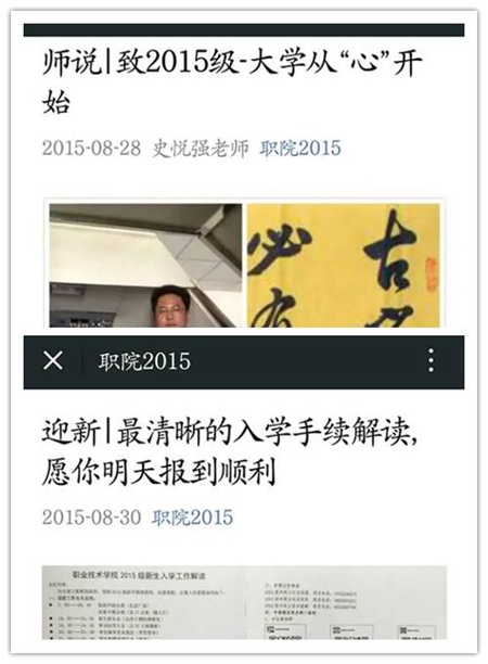 新媒体服务功能的端口前移是学院新媒体建设的要求。为此,学院学工办在学生管理中积极引入了新媒体这一学生乐于接受的服务方式。迎新前夕,学院策划并开通了“职院2015”官方微信平台,相继推出了“师说”、“入学指南”等针对职院学子的个性化定制内容,服务新生入学工作。在新生报到前就将正能量通过新媒体这一手段进行了传播,帮助新生尽快了解大学生活,并力求在今后将各类服务信息和管理举措第一时间传递给2015级全体学生,最终搭建成师生交流、家校互动,服务学生成长的信息平台。