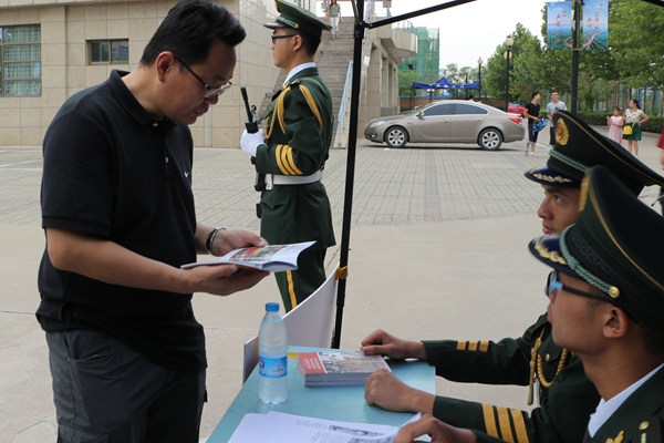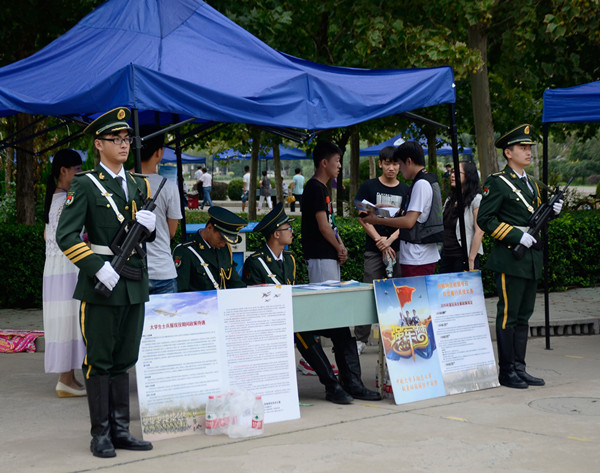 本网讯(记者陈红叶摄影刘子昂 刘刚)8月30日迎新现场,在志愿者的白色校服与来往新生的五彩斑斓的行李中,记者隐约看到了一抹军绿色。原来是为了宣传2015年度征兵政策支起的展台。这个展台首次出现在迎新现场,为即将展开的新生军训以及9月3日的“中国人民抗日战争胜利纪念日”预热。