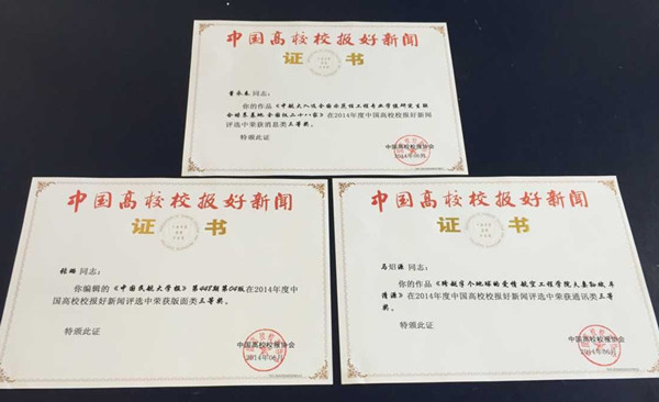 本网讯(学生通讯员郭翔)近日,2014年度中国高校校报好新闻奖评选结果揭晓,来自28个省市自治区的645所高校报送的3032篇作品参评,《中国民航大学报》3项作品获奖,其中2篇为大学生记者团学生记者作品。