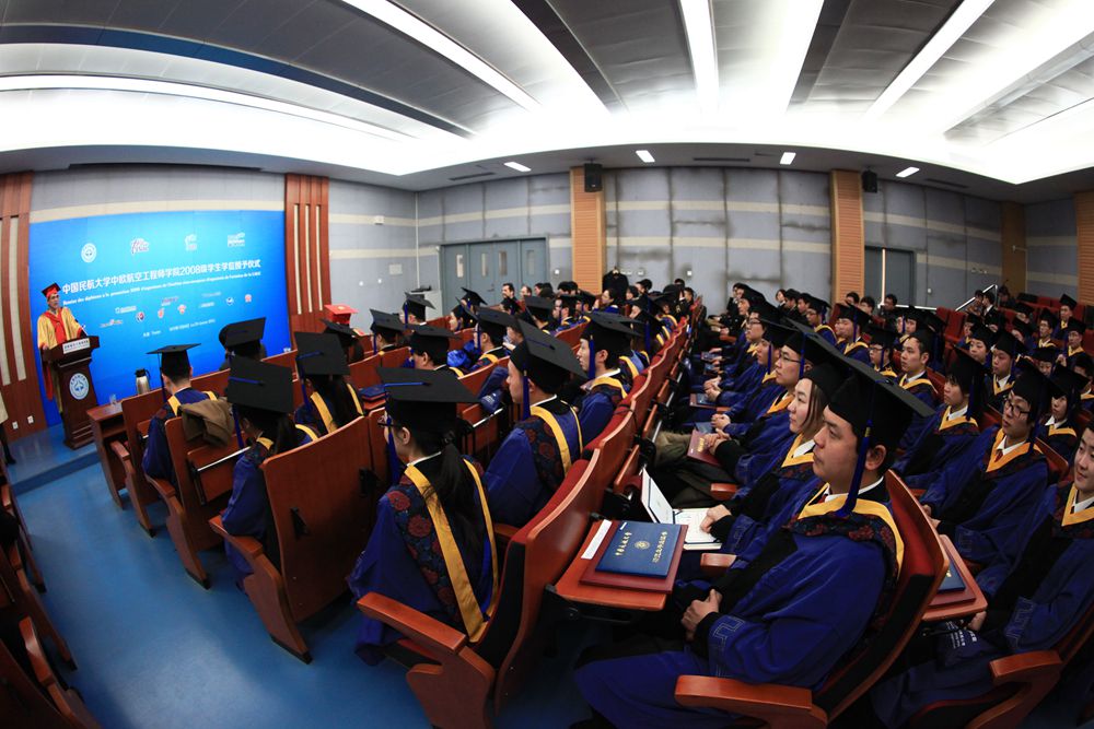 同日下午,法国国立民航大学校长Marc HOUALLA、中国民航大学校长董健康在学校中欧航空工程师学院101室共同为每一名毕业生颁发毕业证书,中航大原校长吴桐水出席并讲话。