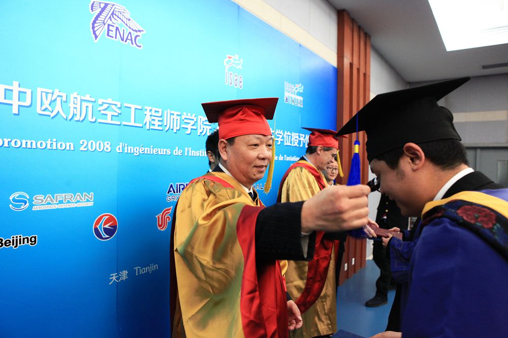 党委书记景一宏在致辞中表示,学校承载着为中国民航事业安全持续发展培养高水平专业技术和管理人才的使命。中法建交51年来,随着两国关系的不断发展,双方民航发展务实有效。中欧航空工程师学院正是在这样的背景下应运而生,不断发展。他指出,在六年半的学习时光里,同学们勤勉刻苦、追求卓越,达到了中法高等教育机构的严格标准,学成毕业,今天取得的成绩凝聚了中法双方专家教授的辛勤汗水,也承载着双方政府、企业寄予的厚望,希望同学们不辱使命,充分发挥聪明才智,为中国的民航事业,为中法两国航空的友好往来做出突出贡献。