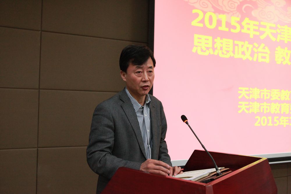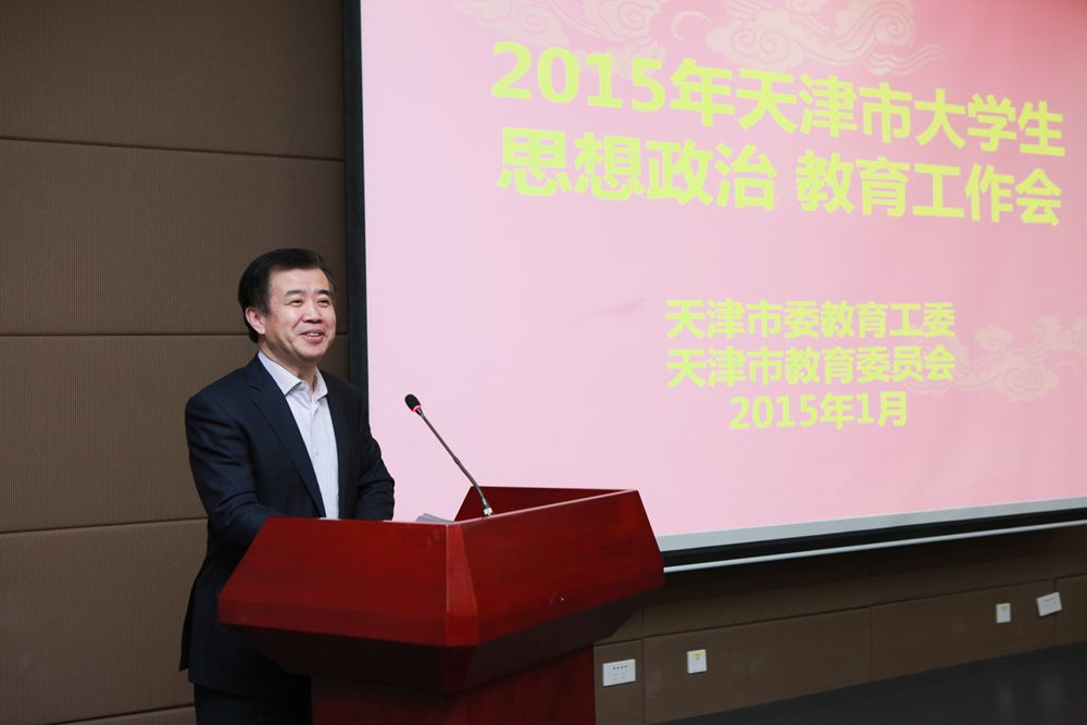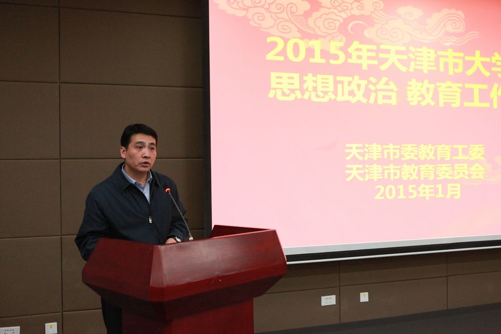 市教委德育处处长赵鸣介绍天津市2014年大学生思想政治教育工作开展情况并部署2015年大学生思想政治教育工作。