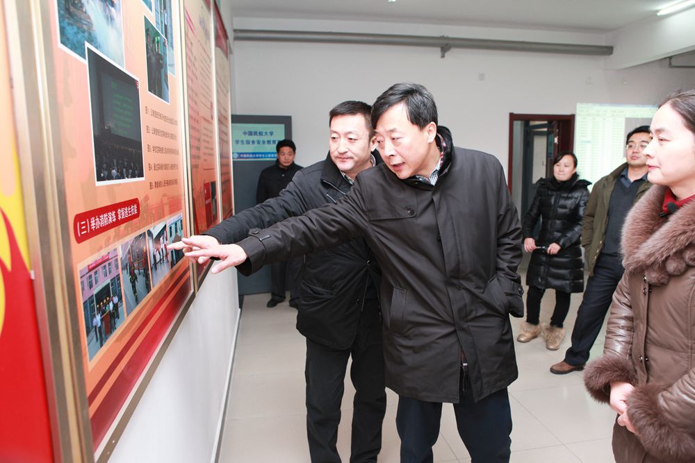 当日下午,孙志良一行实地调研了中国民航大学学生公寓监控中心、宿舍文化长廊、宿舍安全教育室、听取了校园智能车辆管理系统运行情况汇报,查看了保卫处安全教育、管理、服务资料,听取了航空工程学院学生工作情况汇报。