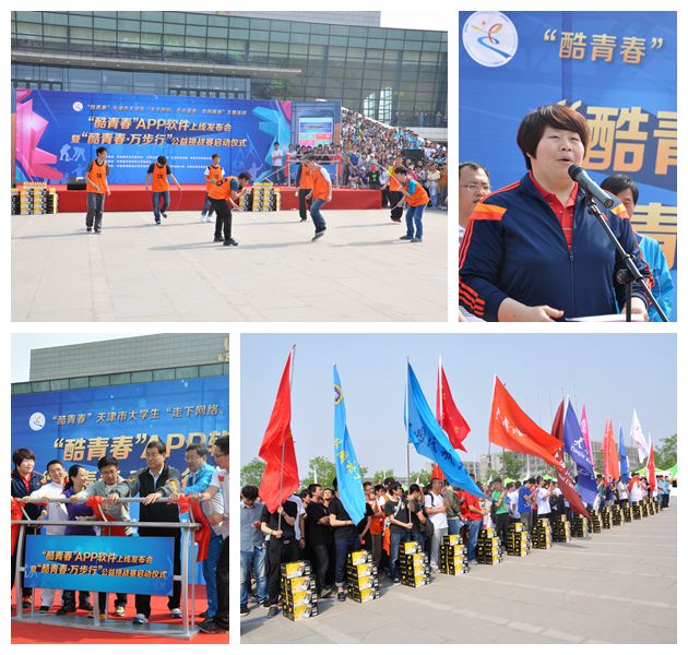 在启动仪式上,奥运冠军、中国民航大学毕业生佟文受聘天津“三走”活动形象大使。团市委、市教委、市体育局、市学联等相关主办单位嘉宾共同启动“酷青春”手机APP软件上线运行。包括中航大在内的全市19所本科高校的2000余名大学生代表共聚启动仪式现场并参加了随后进行的天津市大学生“酷青春•万步行”公益挑战赛活动,各高校的体育类学生社团也进行了现场展示。学校绳键协会的小伙子们代表中航大展示他们的青春活力,以高超的技巧、精彩的表演赢得了全场观众的喝彩。