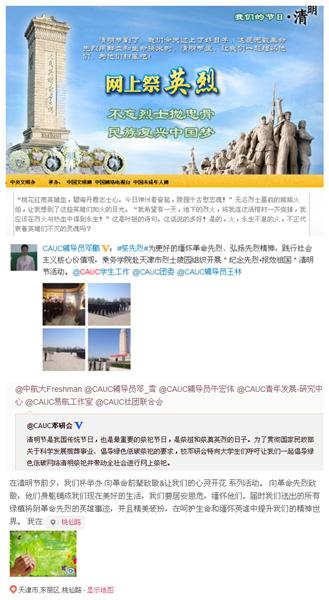 本网讯(通讯员甘勇翔)清明节将至,连日来,中国民航大学陆续开展“网上祭英烈”、“绿植领养”、爱心奉献、演讲朗诵等系列活动,在缅怀先烈、文明祭奠等新风中传递正能量,汲取向上的力量。