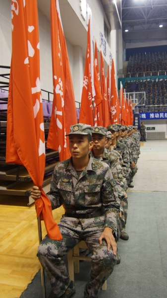 上午8时30分,大会召开。全场起立,奏唱国歌。副校长董健康宣读军训团组成人员名单,党委书记景一宏向军训团团长蒋林华少校授团旗,蒋林华向各连授党旗。
