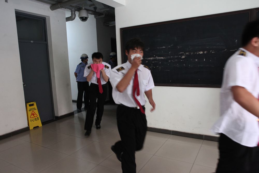 消防演练集灭火疏散救人、校园常见火灾预防及逃生自救等多项目于一体,火情假设学校北24学生公寓二楼因手机充电器短路引发“火灾”。顷刻间,浓烟四起,不断向四周蔓延,发生“火灾”后,学校立即启动应急预案,值班员马上拨打“119”火警电话。同时学校保卫、后勤等工作人员组成救灾和灭火第一梯队力量,引导学生有序疏散。