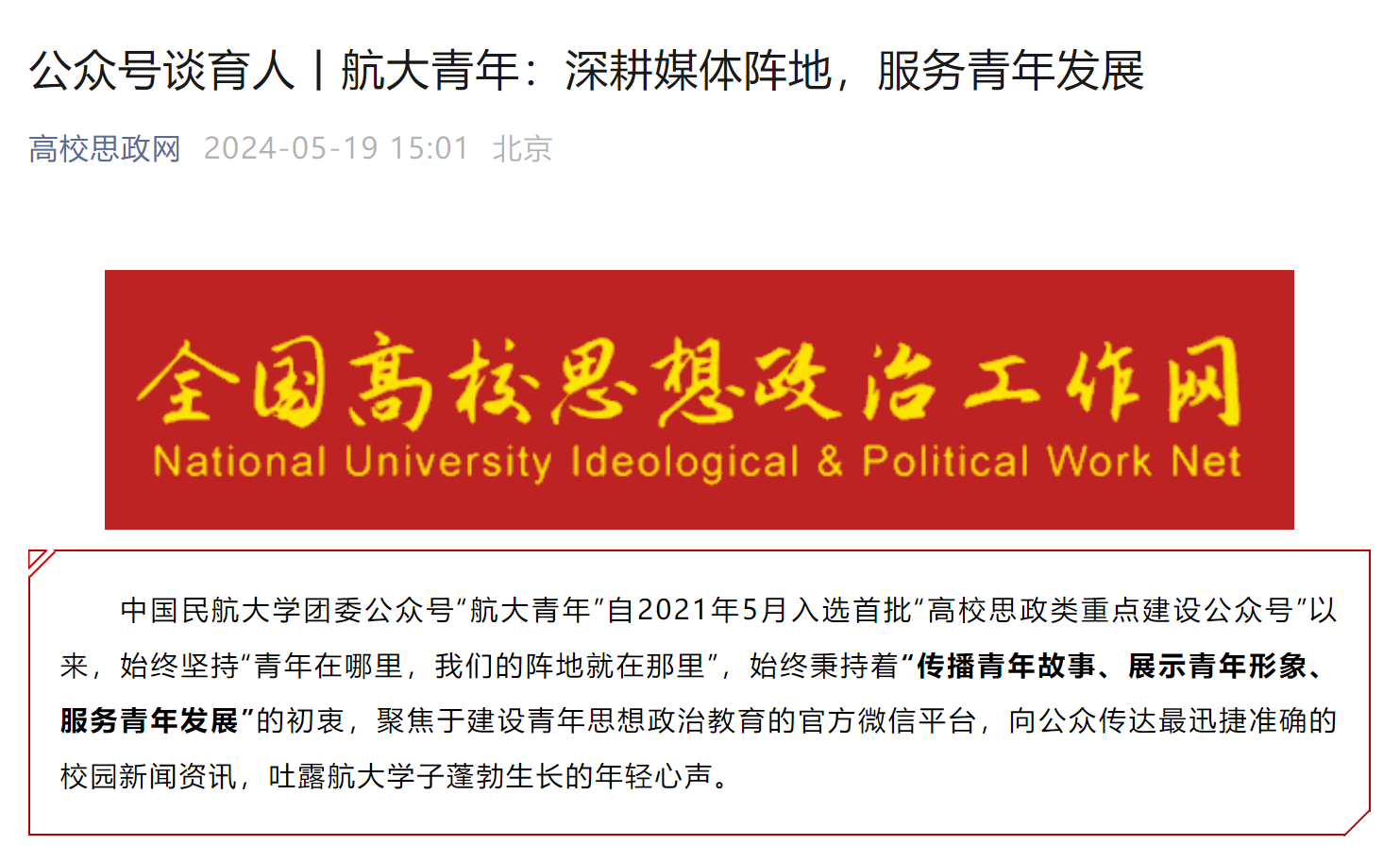 《航大青年:深耕媒体阵地,服务青年发展》报道“航大青年”公众号在内容、制度、团队方面的建设情况,集中体现“航大青年”聚焦“青年思想政治教育的官方微信平台”的定位,以网络思政的创新发展推动高校思想政治工作走深走实,服务学校“大宣传”格局,不仅展现学校共青团在思政育人方面的影响力和号召力,也是对学校共青团思政育人工作的充分肯定。“航大青年”公众号作为学校共青团思政教育的重要窗口,深入学习贯彻习近平文化思想,始终以热忱发出中航大青年声音、传递中航大青年力量,深耕媒体阵地,服务青年发展。