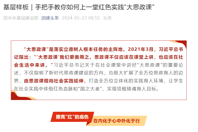 “团建头条”公众号刊发的《基层样板|手把手教你如何上一堂红色实践“大思政课”》专题报道,展现空中交通管理学院团委通过具体、生动的实践案例,在思政育人层面把握红色文化的“深度”,通过沉浸式开展“四个一”活动,即“上好一堂红色课”“诵读一首长征词”“采访一位老党员”“开展一次交流营”,将传统思政教育模式下的单向理论灌输,转化为接地气、符合大学生认知规律的具体实践活动,学生参与度高、融入感强,能够自觉吸收和转化红色文化的精神价值。