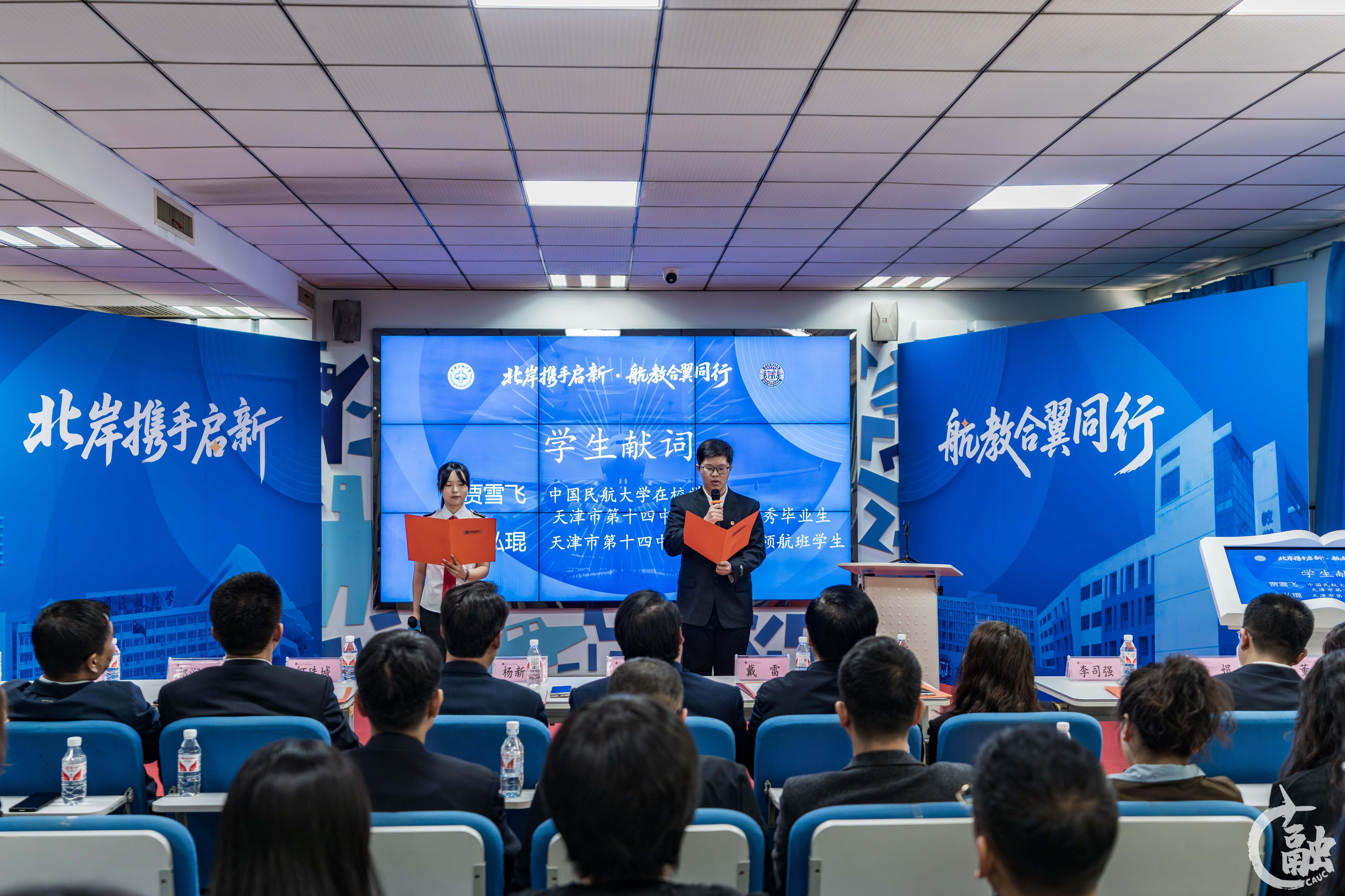 中国民航大学在校生、天津市第十四中学2023届优秀毕业生贾雪飞,天津市第十四中学高一年级领航班学生朱弘琨作为学生代表献词,表达对民航事业的向往和努力学习的斗志。