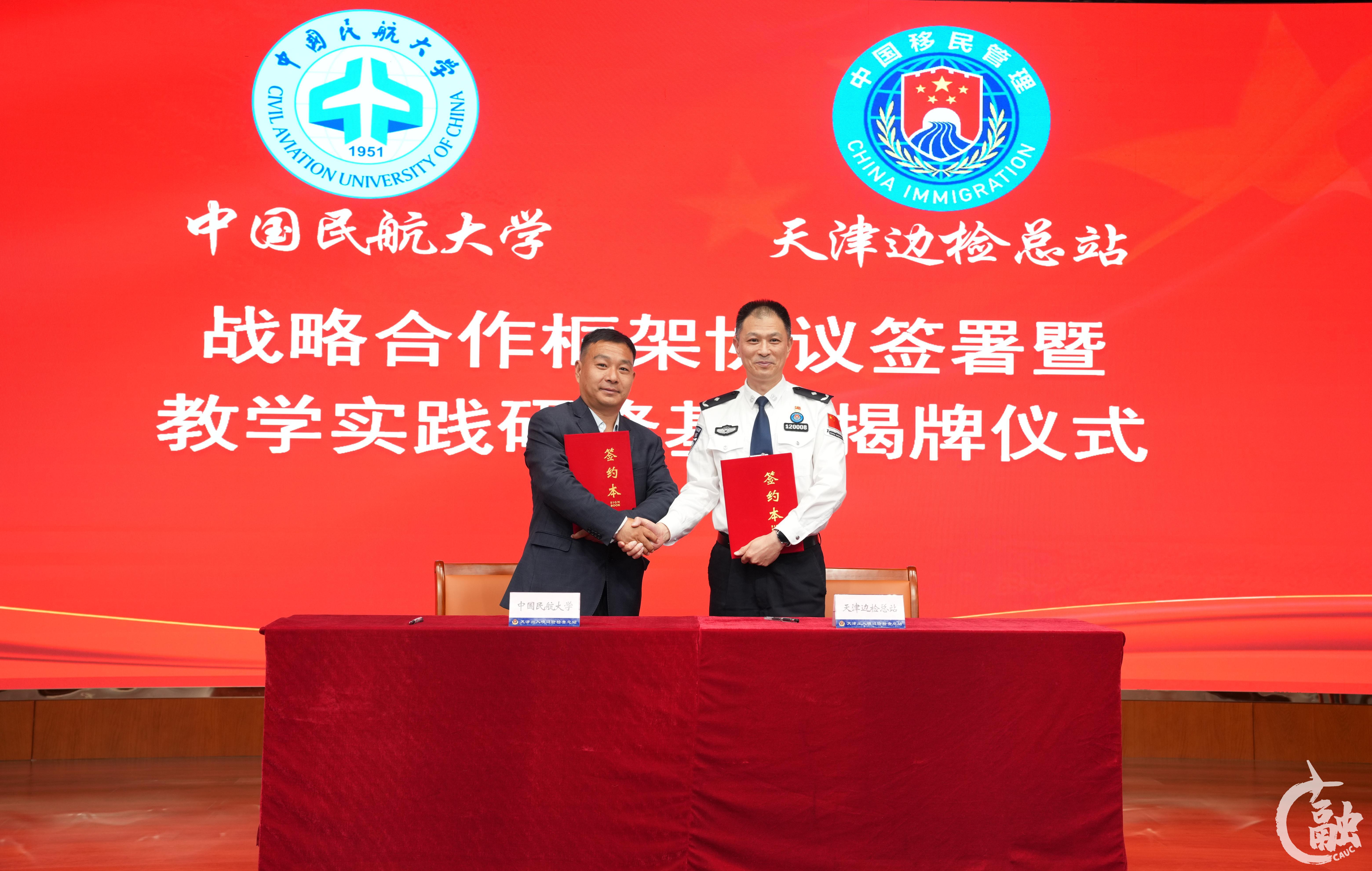刘清涛与中国民航大学发展规划与学科建设处郭润夏代表双方签署战略合作框架协议。