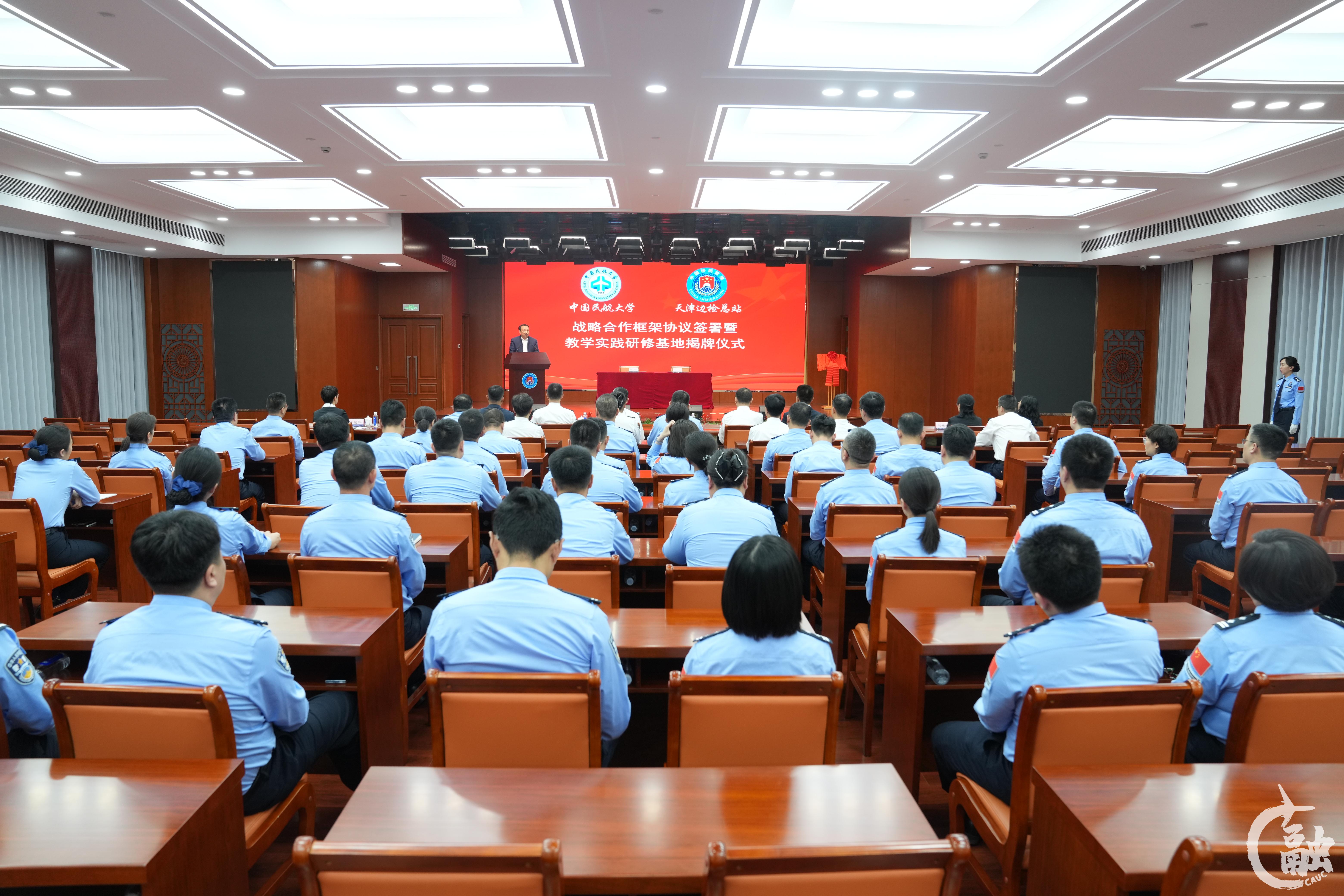 本网讯 5月9日上午,中国民航大学与天津出入境边防检查总站(以下简称“天津边检总站”)战略合作框架协议签署暨“教学实践研修基地”揭牌仪式在天津边检总站警官培训基地四楼报告厅举行。天津边检总站党委书记、总站长王昌丰与中国民航大学党委副书记、校长丁水汀致辞并为“教学实践研修基地”揭牌。天津边检总站党委委员、副总站长陈强,天津边检总站党委委员、政治处主任刘清涛出席活动。天津边检总站机关各部门、各直属单位主要负责同志及总站机关民警代表,中国民航大学党办校办、发展规划与学科建设处、国际处、外国语学院相关负责人参加。