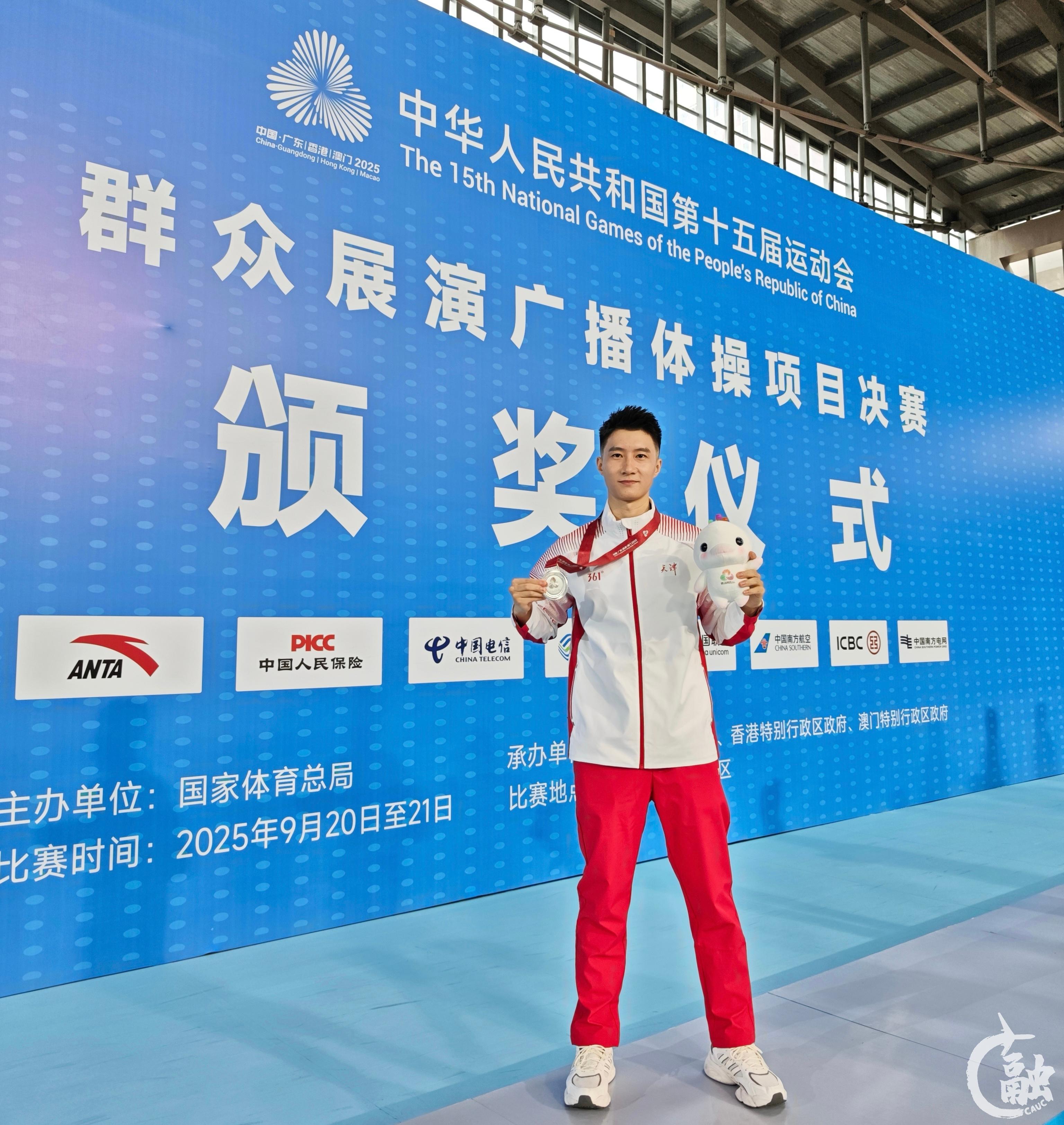 本网讯 近日,第十五届全国运动会群众展演广播体操项目决赛在广东珠海落下帷幕。中国民航大学国有资产与实验室管理处郑树桐作为天津代表队队员,与队友团结协作、奋勇拼搏,以93.23分的优异成绩斩获银牌,展现了天津体育的卓越风采,也为学校赢得了荣誉。