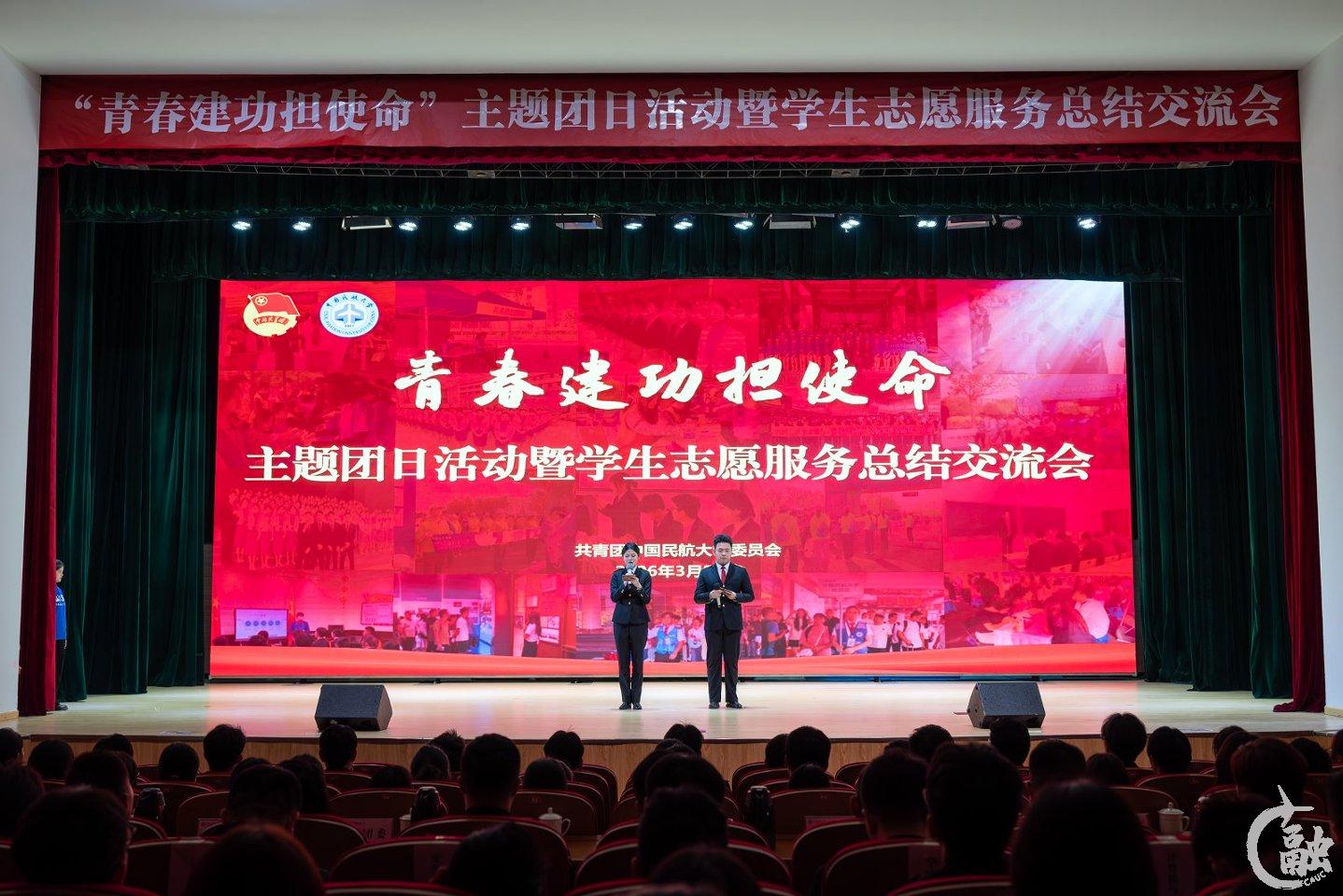 本网讯 3月27日,中国民航大学“青春建功担使命”主题团日活动暨学生志愿服务总结交流会在东丽校区北区礼堂举行。校党委副书记王志强出席并讲话。宁河团区委、东丽团区委、天津滨海国际机场团委相关负责同志,学校党委学工部、校团委、研究生院、体育部相关负责同志,各学院主管学生工作领导、团委书记及辅导员代表,以及志愿者代表齐聚现场,共同回顾过往志愿服务成果,凝聚民航青年志愿担当的青春力量。