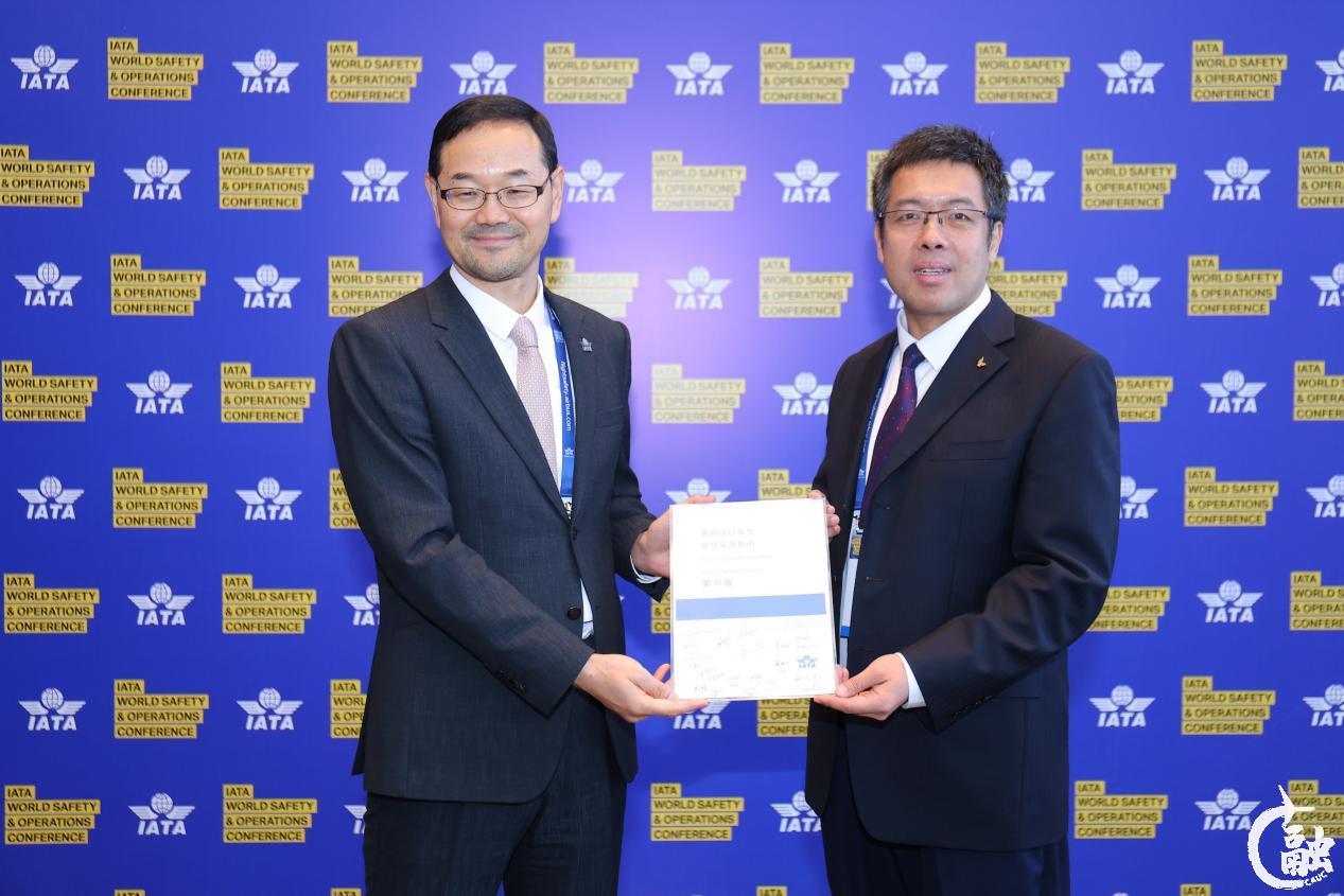IATA北亚区副总裁解兴权(左)赠送“客舱运行安全最佳实践指南(第十版)”手册中文版纪念册