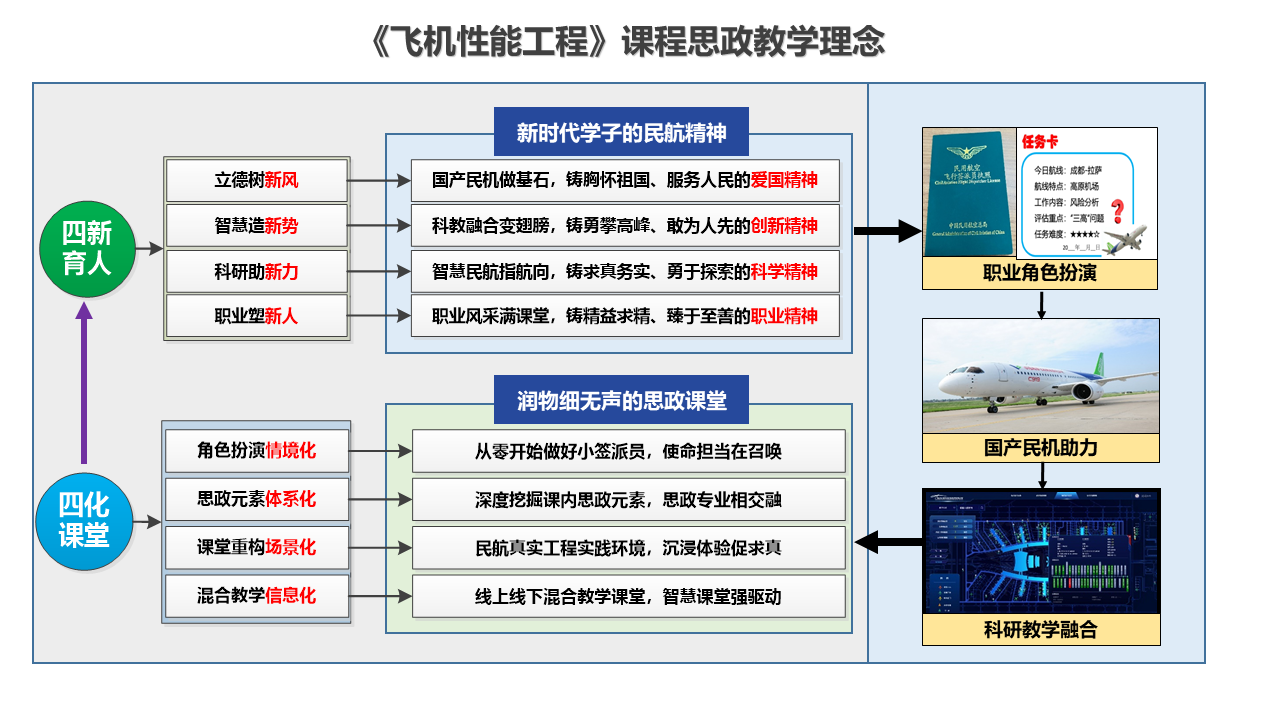 空中交通管理学院任强负责的《飞机性能工程》是民航交通管理、交通运输等专业的一门核心专业课。作为首批国家级线下一流本科课程。该课程围绕落实立德树人根本任务,凝练国产民机和专业性能知识所蕴含的思想价值和精神内涵,以“国产大飞机”为专业教学与思政建设有机融合的核心载体,厚植文化自信和家国情怀,以创新“四新育人”教育理念,以职业岗位角色扮演助力实现教学任务个性化,重构四化课堂,健全改进机制,提升自主学习内驱动力,培养德智体美劳全面发展的高素质专业技术人才。