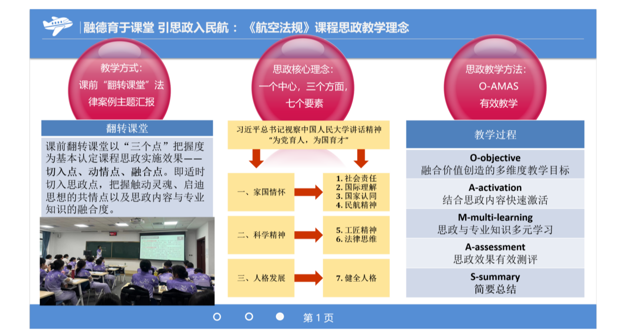 乘务学院孙一平负责的空中乘务专业《航空法规》课程,贯彻“融德育于课堂,引思政入民航”主题,进行思政体系规划设计,将有效教学模型推广应用于程思政教学设计之中,充分挖掘课程思政元素,形成完整的课程思政教学体系。在教学模型中的教学目标设计、迅速激活、多元学习、有效测评、简要总结的五个环节中,将思政元素精巧构思,与课程内容深度融合,以学生喜闻乐见的方式,将课程思政中的道理讲深、讲透、讲活,真正将课程思政贯穿于线上及线下教学的全过程之中,落实课程思政育人目标。