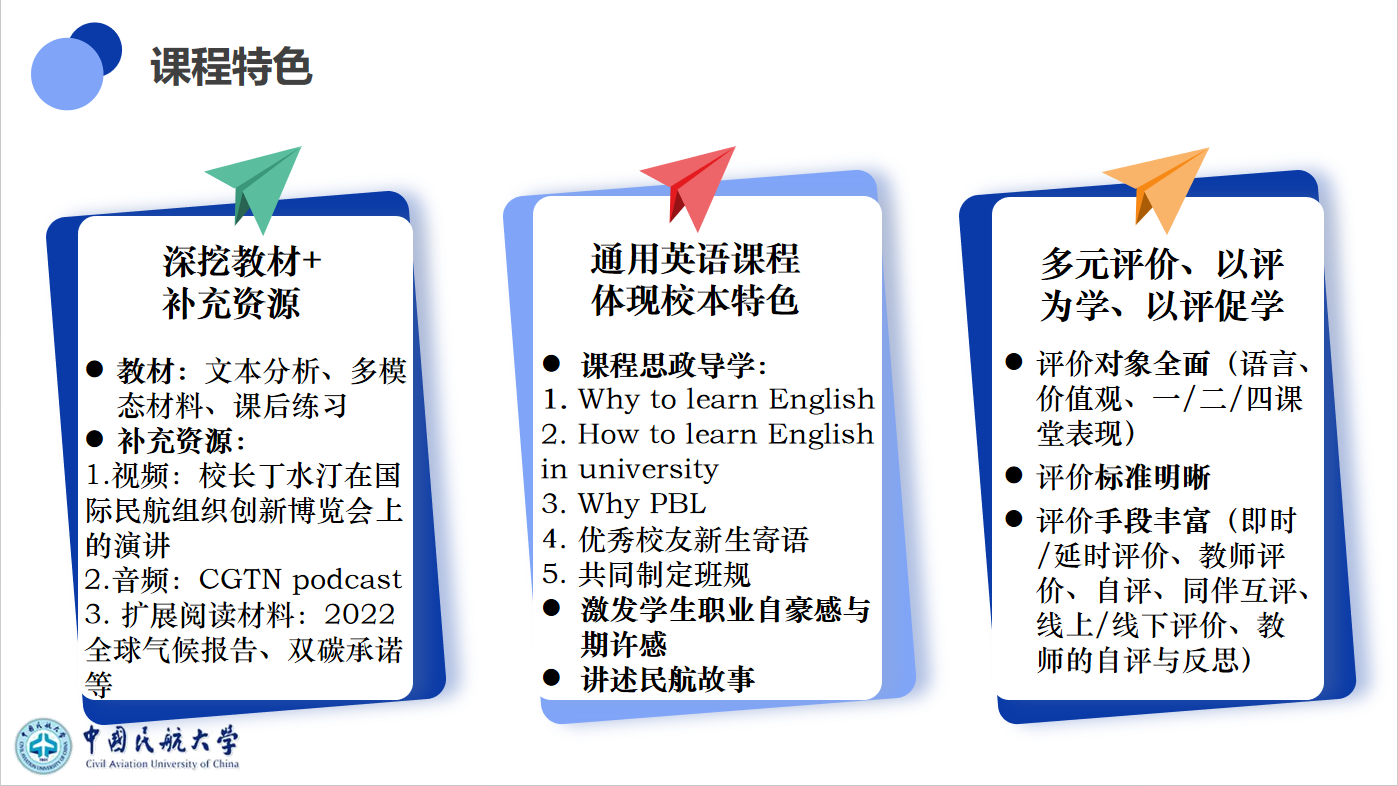 《讲好中国故事“建民航、兴民航、强民航”,构建中航大精神谱系— <飞机结构材料>课程思政教学案例》《依托项目式学习(PBL)的校本特色外语课程思政教学案例》《聚焦专业和课程特色,多角度挖掘育人功能— <材料化学概论>课程思政教学探索与实践》《东方风来,翼起翱翔,国产大飞机为思政课堂插上翅膀》《传承民航精神,科研回哺教学—中国民航大学“维修工程分析”课程思政教学案例》《融德育于课堂,引思政入民航—基于O-AMOS模型的<航空法规>课程思政教学案例》获评十佳典型案例。《锤炼机务素养,涵养家国情怀—飞机电气系统维修工程实践课程思政探索与实践》《基于智慧学习平台的<雷达管制>思政学习资源建设与实践》《引领价值、产出能力、沟通四个课堂的课程思政教学改革模式—以<思辨英语>为例》《担思政之担赋权民航精神 肩职业之责增能英语技能—民航基础英语课程思政建设案例:<通用英语听说(1)>》《理论与实践相结合的民航特色课程思政建设—以航空发动机电气控制系统课程为例》获评优秀案例。