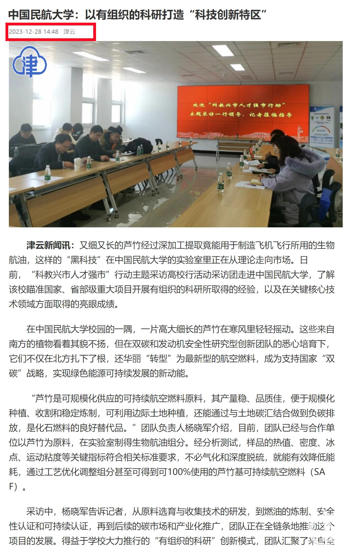 本网讯 日前,“科教兴市人才强市行动”主题采访高校行活动走进中国民航大学,中央级媒体和市级媒体记者入校深度采访报道学校科教工作成果。相关报道刊发在学习强国、中央广电总台国际在线、《天津教育报》头版头条、《天津教育报》新媒体、《中国企业报》、津云、天津广播等媒体平台,引起社会广泛关注。