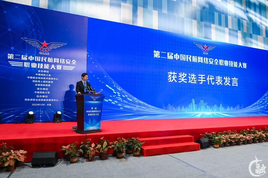 获奖选手代表、深圳空管站包俊发言,分享参加本届大赛的感受和收获,明确下一步努力方向,并号召广大职工以高度的使命感、责任感和专业的技术能力,牢牢守住民航网络安全。要把比赛中的收获、思考和成长带到工作实际中,扎根基层、精进业务,继续做好民航网络安全的防火墙、安全盾、守护门,匠心筑梦,技能报国,心怀梦想,勠力同心,踔厉奋发,为推进民航高质量发展贡献智慧和力量。