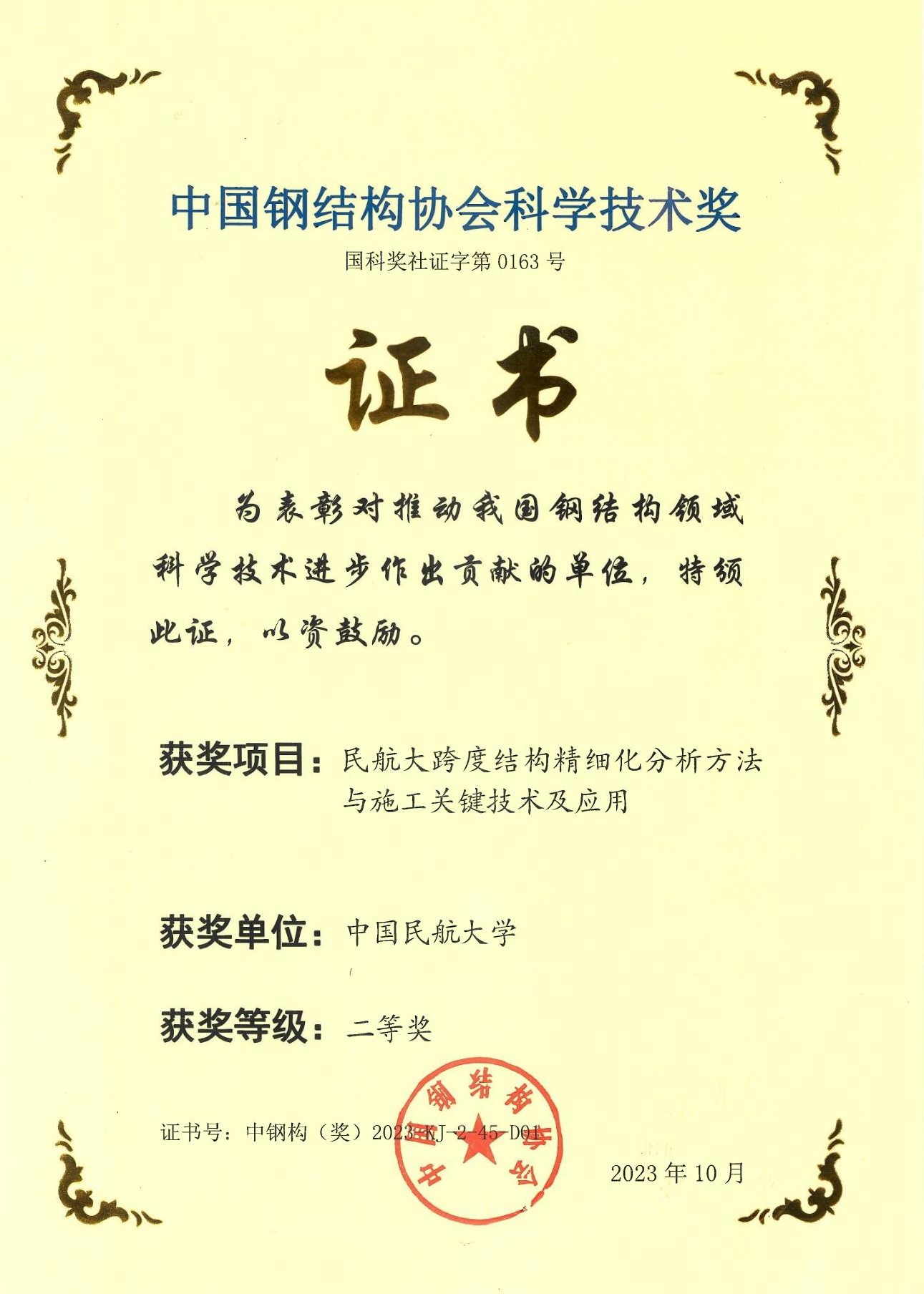 本网讯 日前,2023年度中国钢结构协会科学技术奖颁奖典礼在四川成都举办。中国民航大学齐麟教授科研团队完成的科技研究成果《民航大跨度结构精细化分析方法与施工关键技术及应用》荣获2023年度中国钢结构协会科学技术奖二等奖。该成果由中国民航大学、天津大学、中建八局第四建设有限公司、天津市建工工程总承包有限公司、河北工程大学合作完成,中国民航大学齐麟、陈宇、黄信、刘国光、李长辉、吴堃等教师参与该项目的研究。
