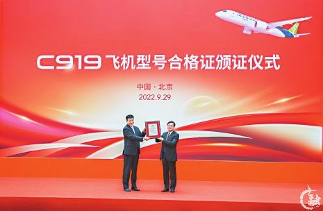 中国民航局局长宋志勇向中国商飞董事长贺东风颁发C919飞机型号合格证