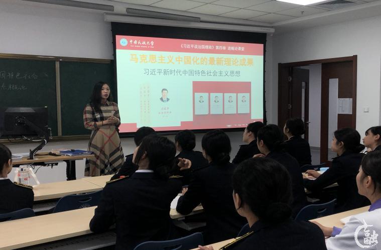 马克思主义学院以推动《习近平谈治国理政》第四卷融入思政课为主题进行开学第一课。在宁河校区全新落成的教学楼里,马克思主义学院概论教研室青年教师郭英楠向2021级乘务学院空中乘务专业的75名学生讲述主题为“《习近平谈治国理政》第四卷融入概论课”的开学第一课,将《习近平谈治国理政》第四卷融入到“毛泽东思想和中国特色社会主义思想概论”课的导论部分。课上对《习近平谈治国理政》第四卷的主要内容、逻辑结构、学习方法进行解读,阐释《习近平谈治国理政》第四卷作为马克思主义中国化的最新成果,贯穿着马克思主义科学的立场观点和方法,既是方法论,又是实践论,彰显出强大的思想力量,引导学生们在学懂弄通上下功夫,在实践中努力践行其中的精神实质。
