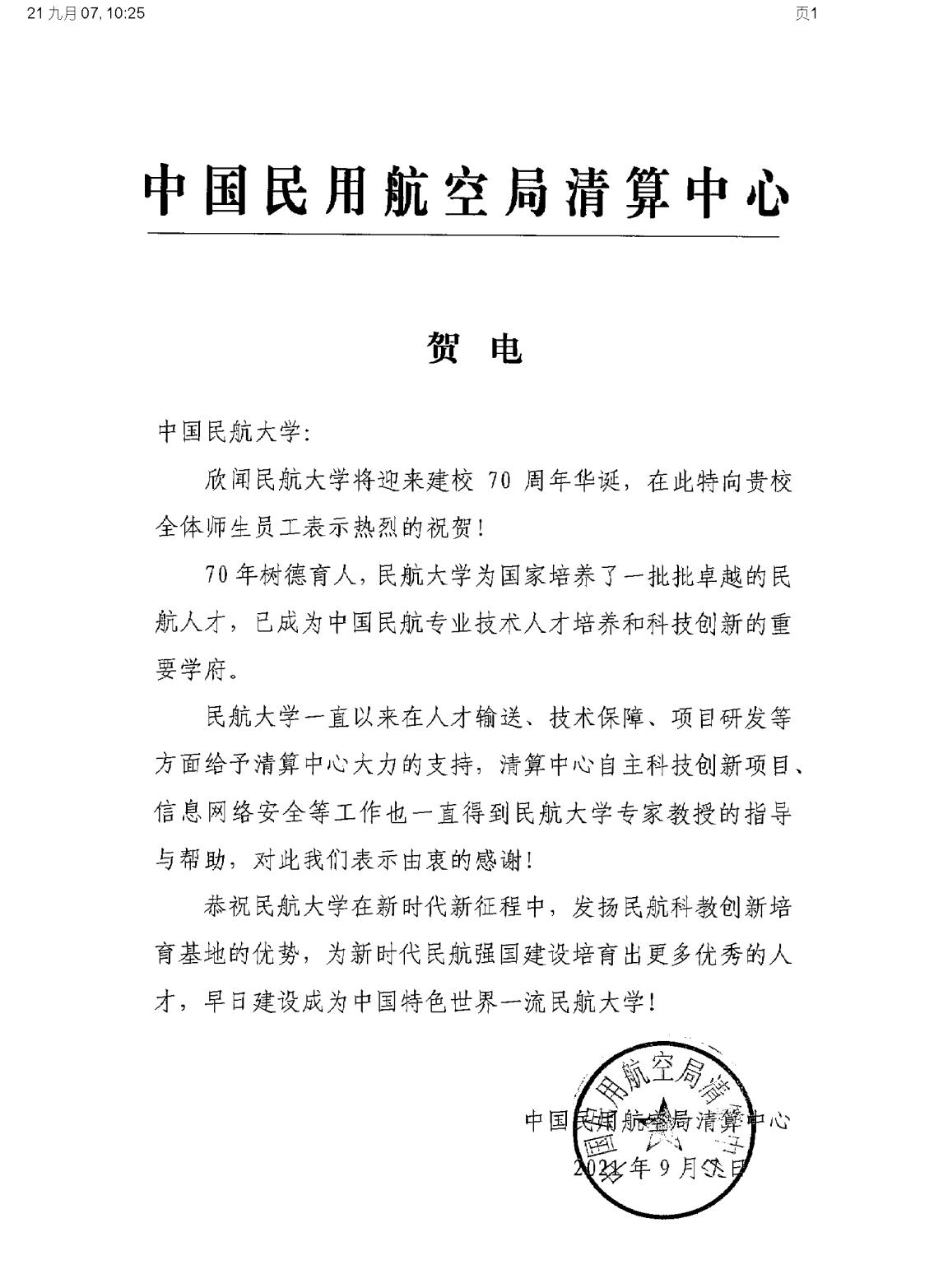 【70周年校庆】中国民用航空局清算中心发来贺信