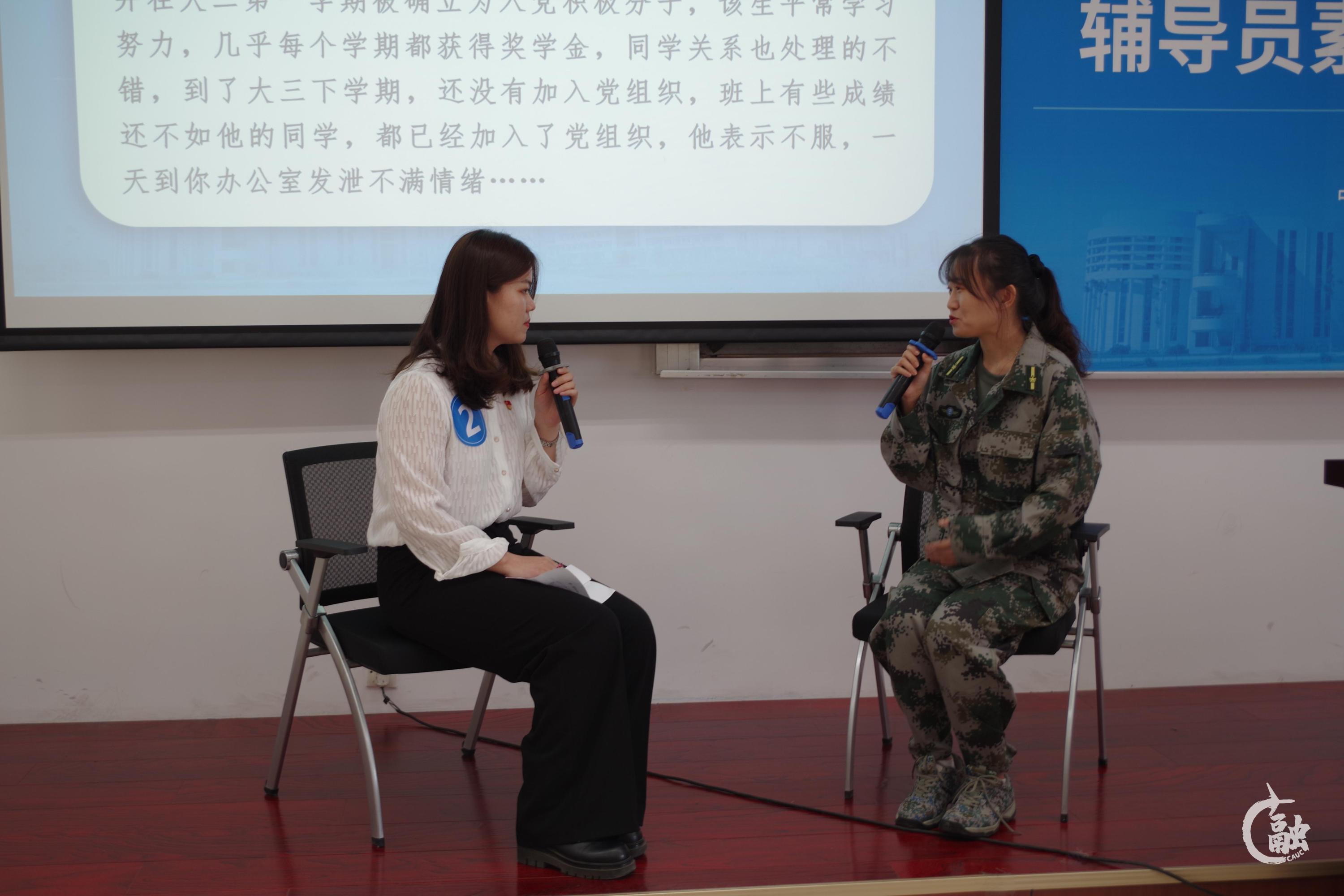在谈心谈话环节,选手们围绕党团建设、宗教教育、毕业生教育、宿舍管理等问题与演员开展谈心谈话。参赛选手们随机应变,沉着应对,能够第一时间发现问题核心点,以春风化雨的方式教育引导学生,用心解决学生存在的热点和难点问题。