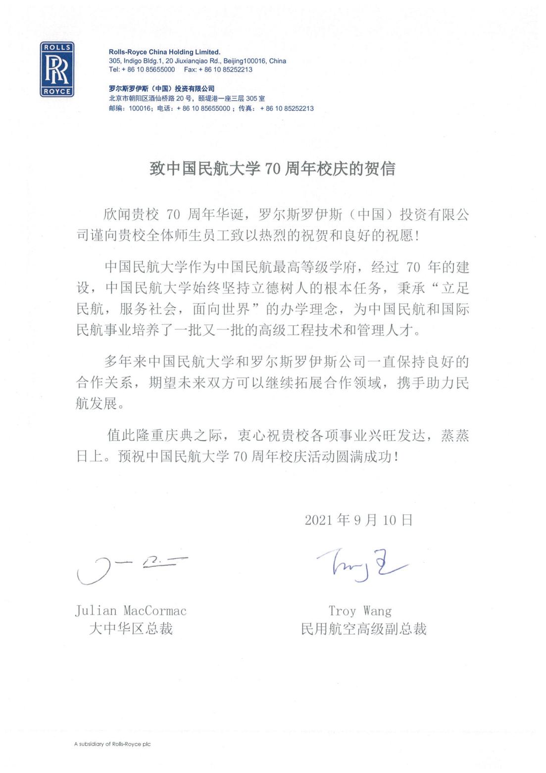 【70周年校庆】罗尔斯罗伊斯(中国)投资有限公司发来贺信