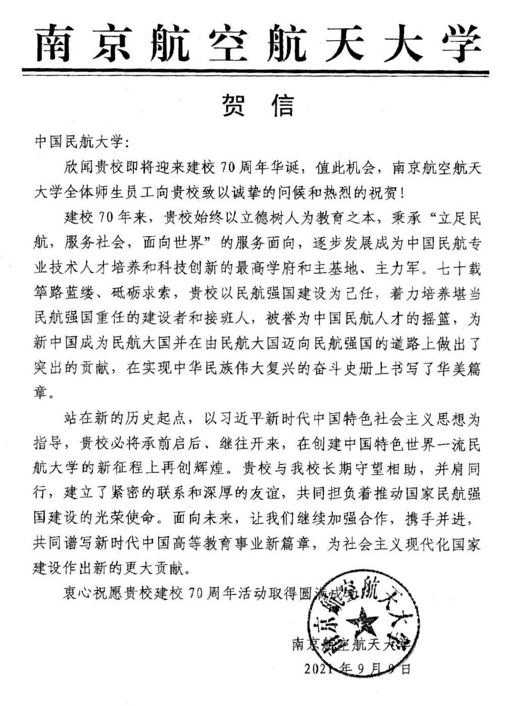 【70周年校庆】天津航大中璟科技有限公司发来贺信