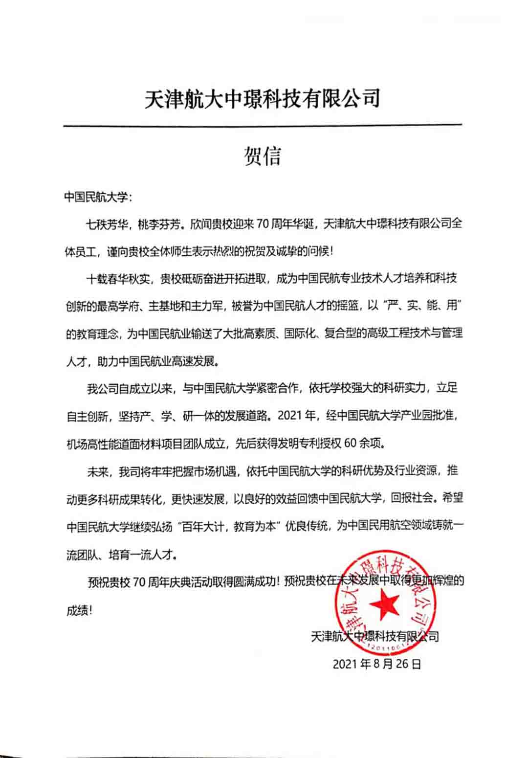 【70周年校庆】天津航大中璟科技有限公司发来贺信