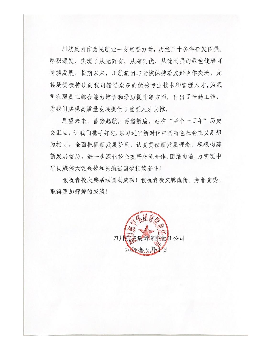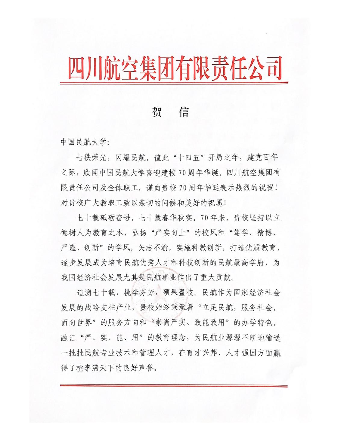 【70周年校庆】四川航空集团有限责任公司发来贺信