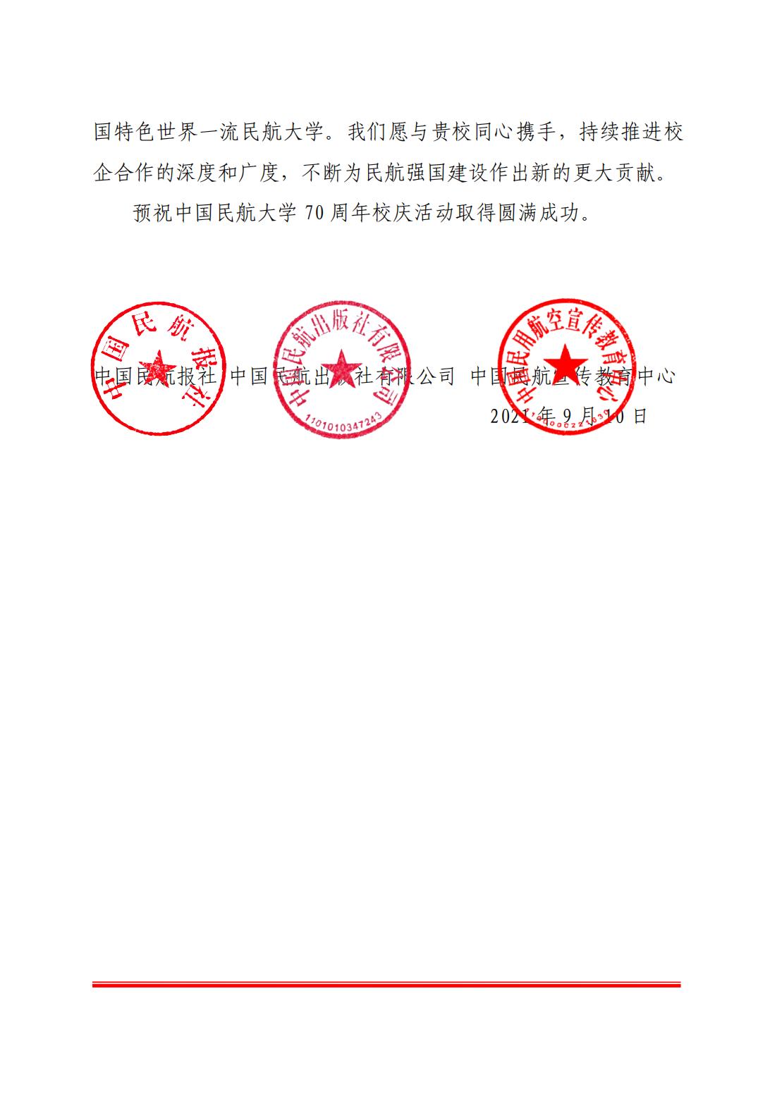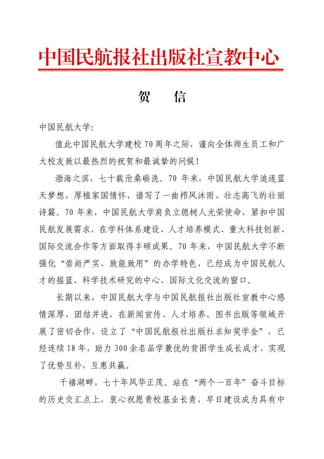 【70周年校庆】中国民航报社出版社宣教中心发来贺信