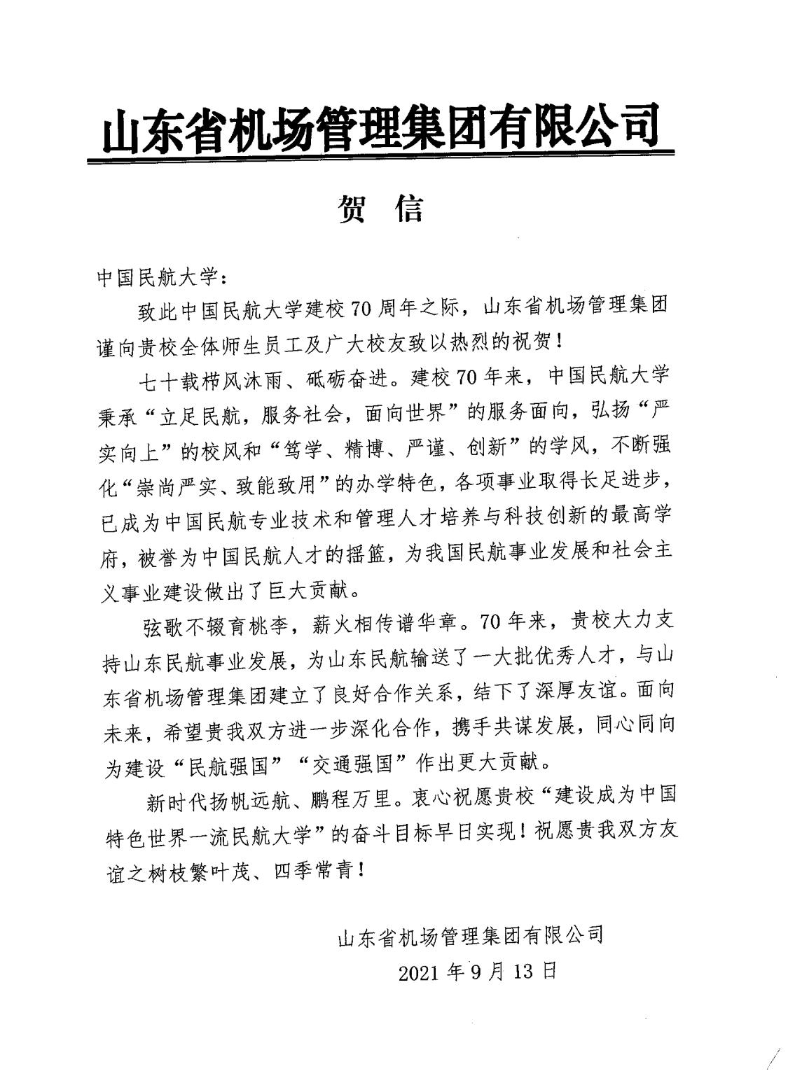 【70周年校庆】山东省机场管理集团有限公司发来贺信