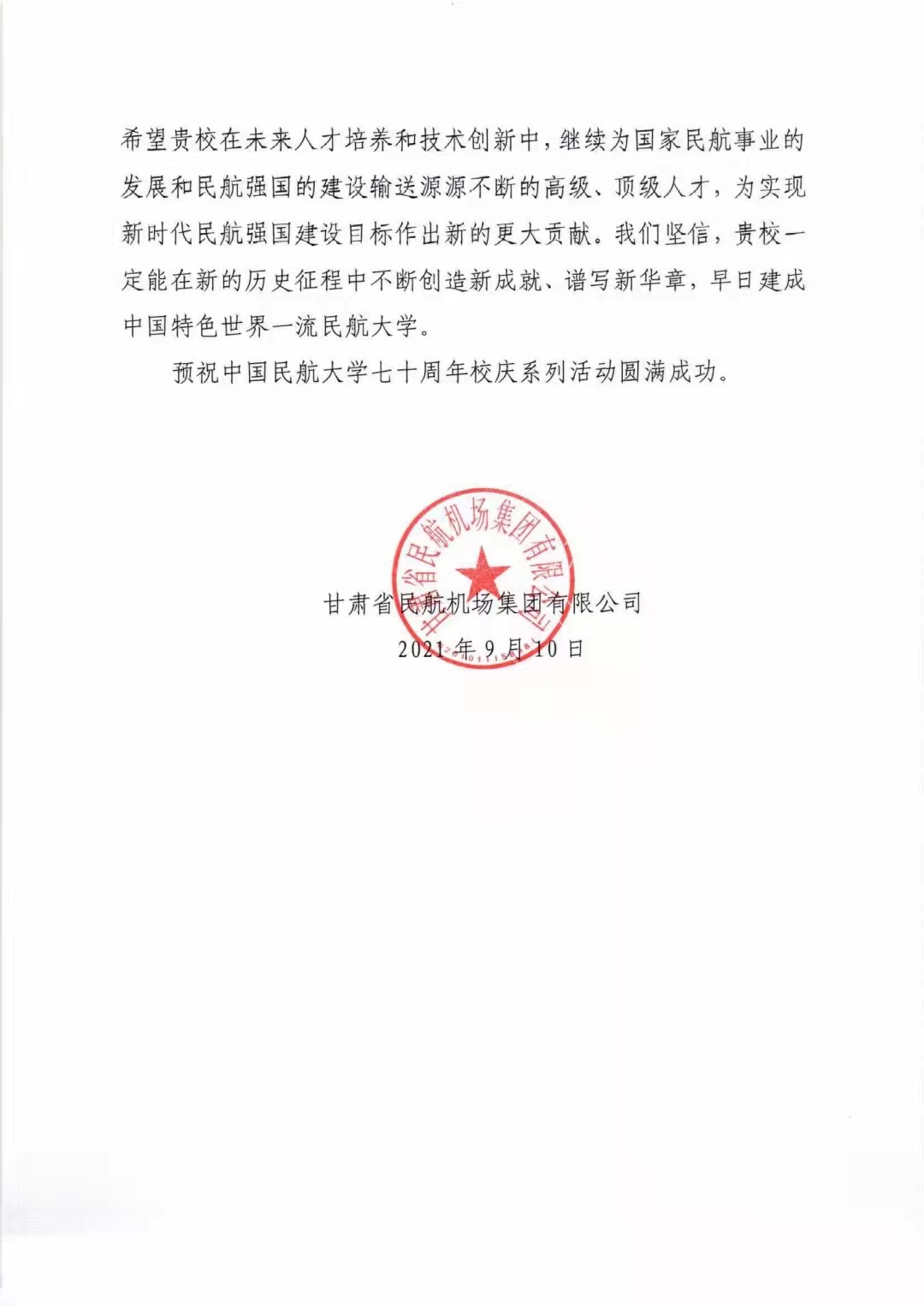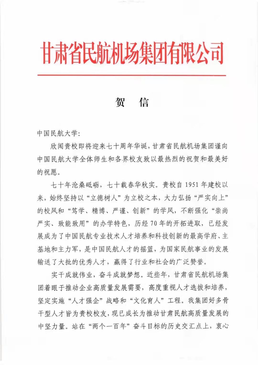 【70周年校庆】甘肃省民航机场集团有限公司发来贺信
