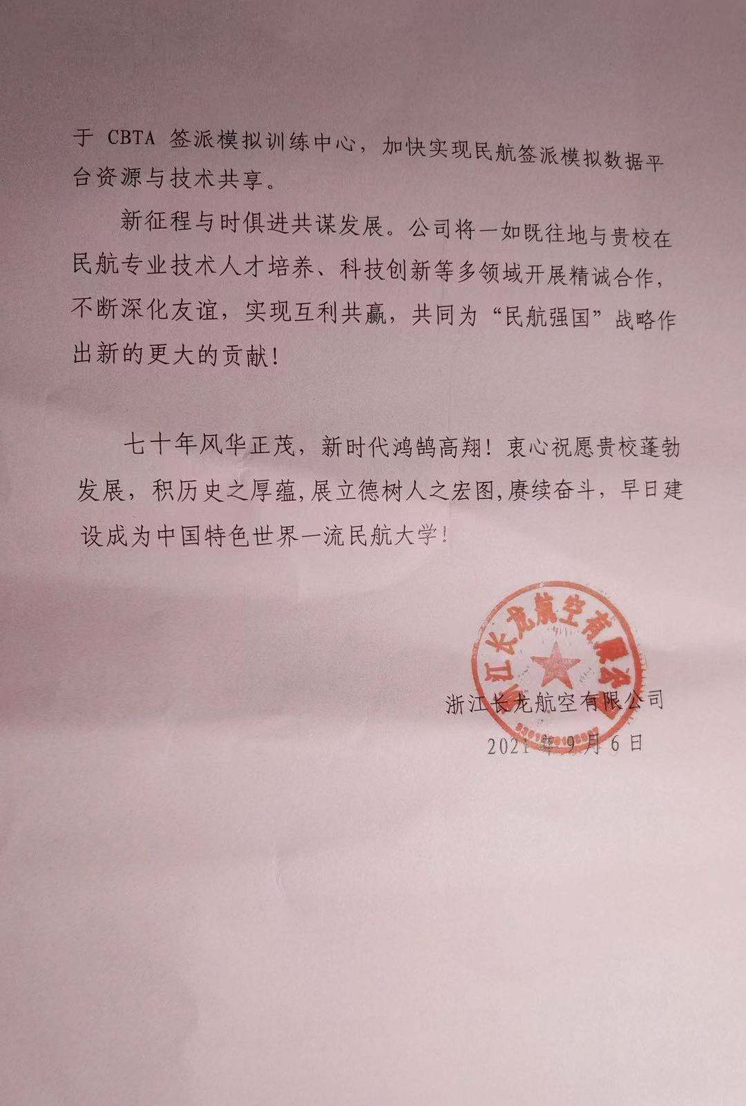 【70周年校庆】浙江长龙航空有限公司发来贺信