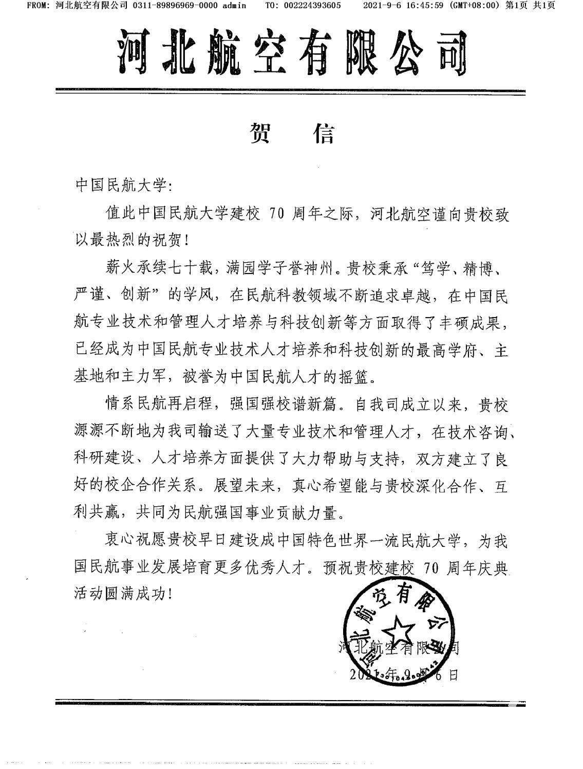 【70周年校庆】浙江长龙航空有限公司发来贺信