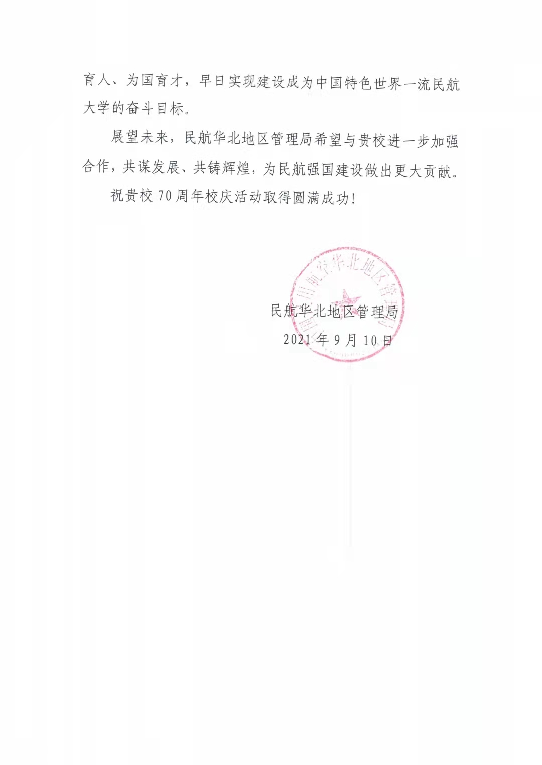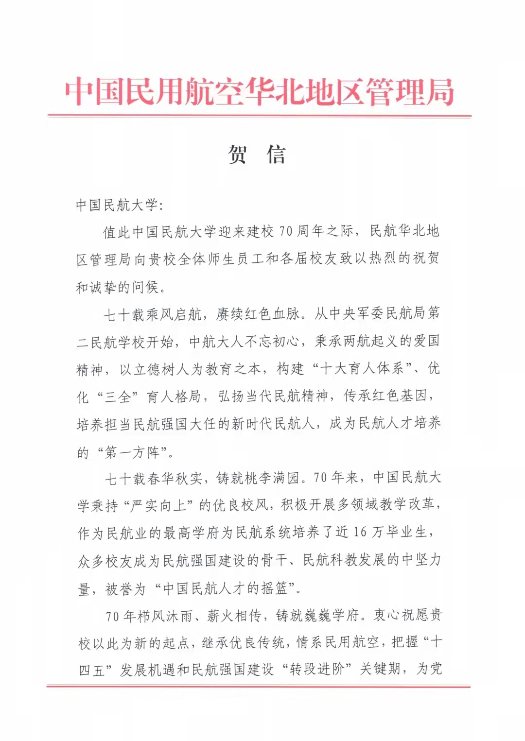 【70周年校庆】中国民用航空华北地区管理局发来贺信