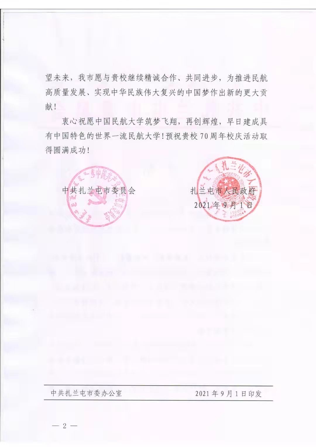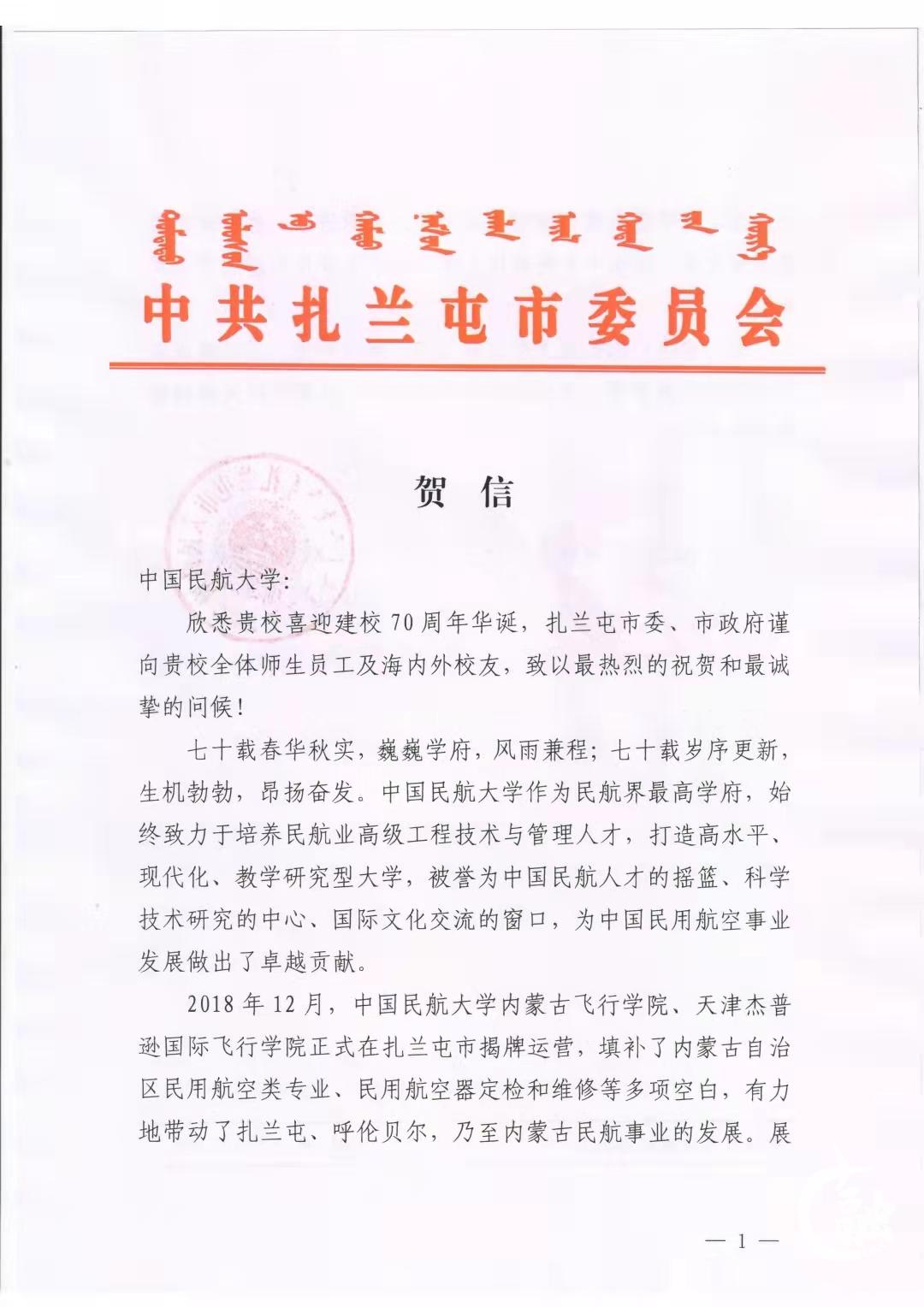 【70周年校庆】中共扎兰屯市委员会发来贺信