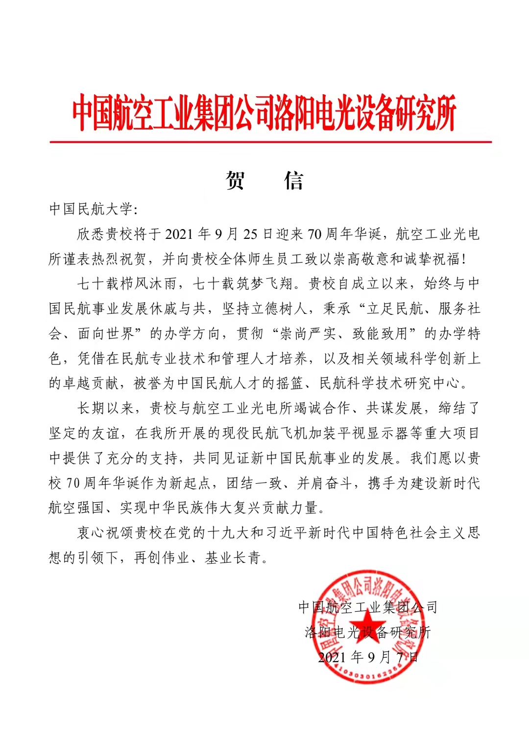 【70周年校庆】中国航空工业集团公司洛阳电光设备研究所发来贺信