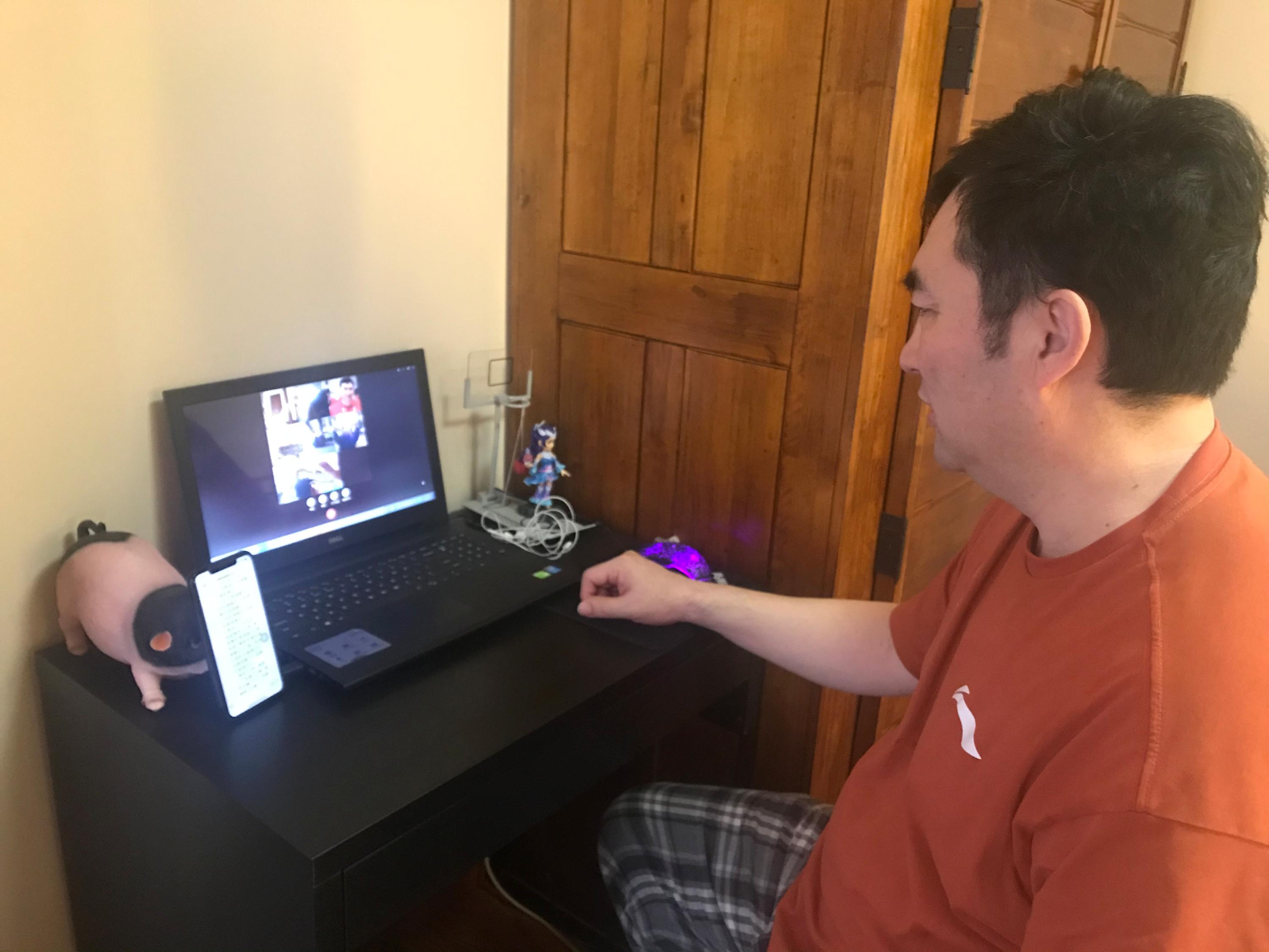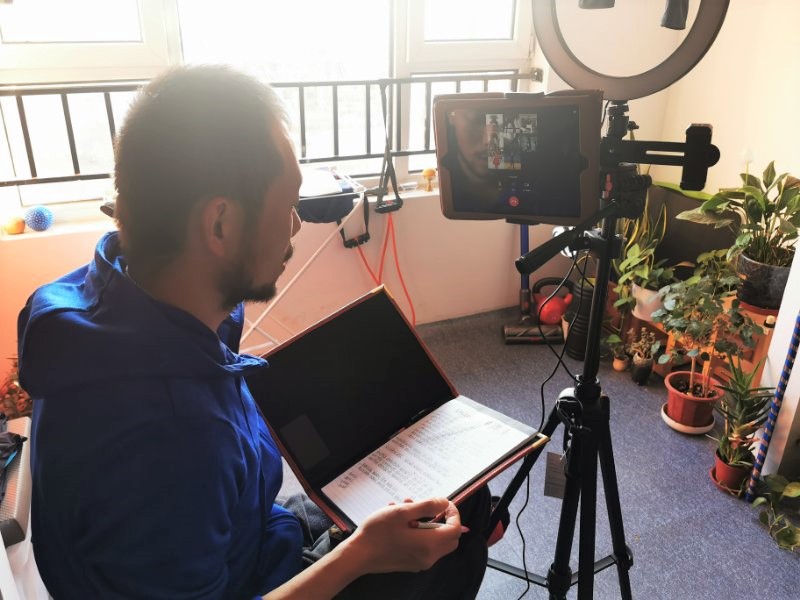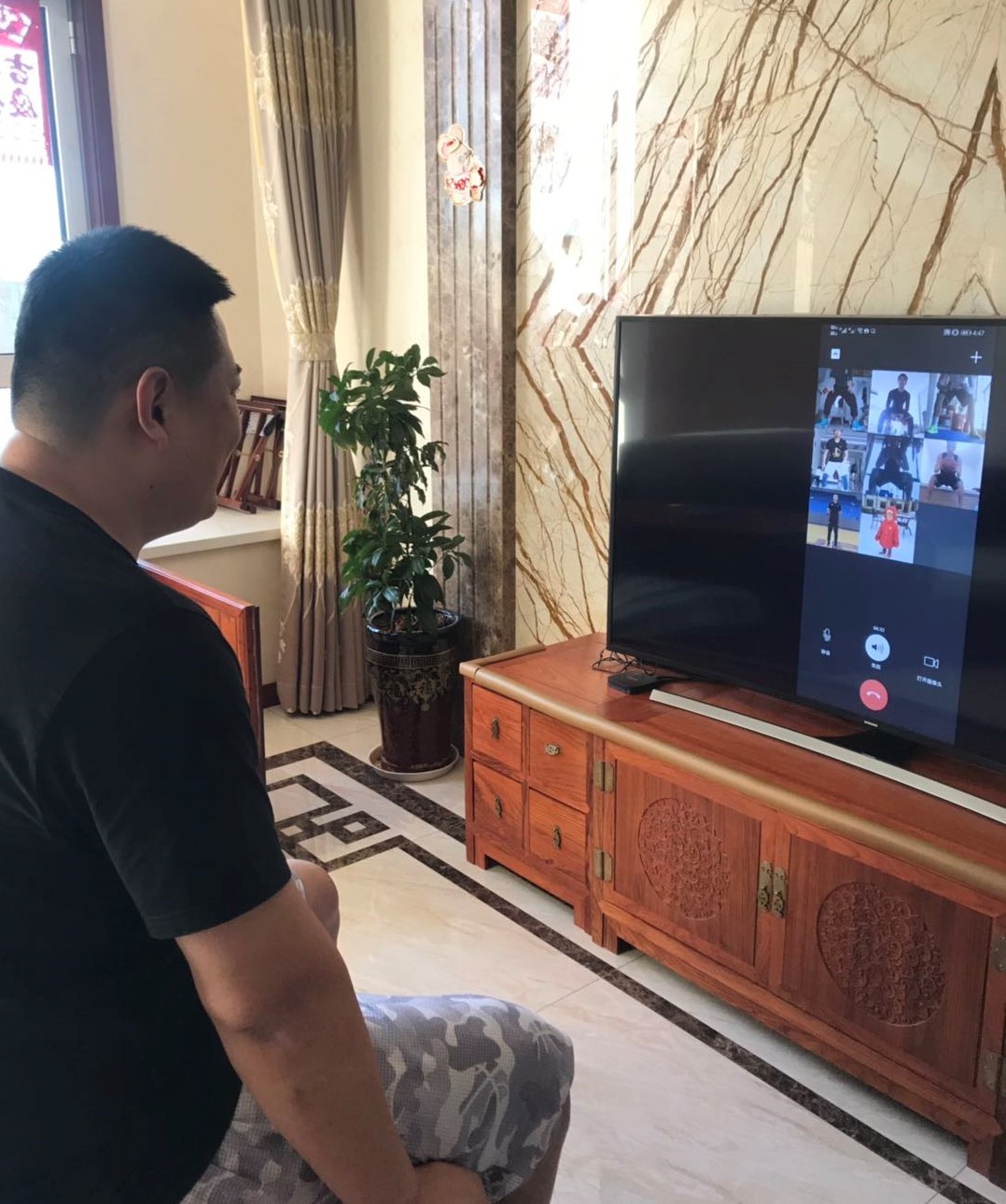 主教练郑军通过视频指导队员体能训练