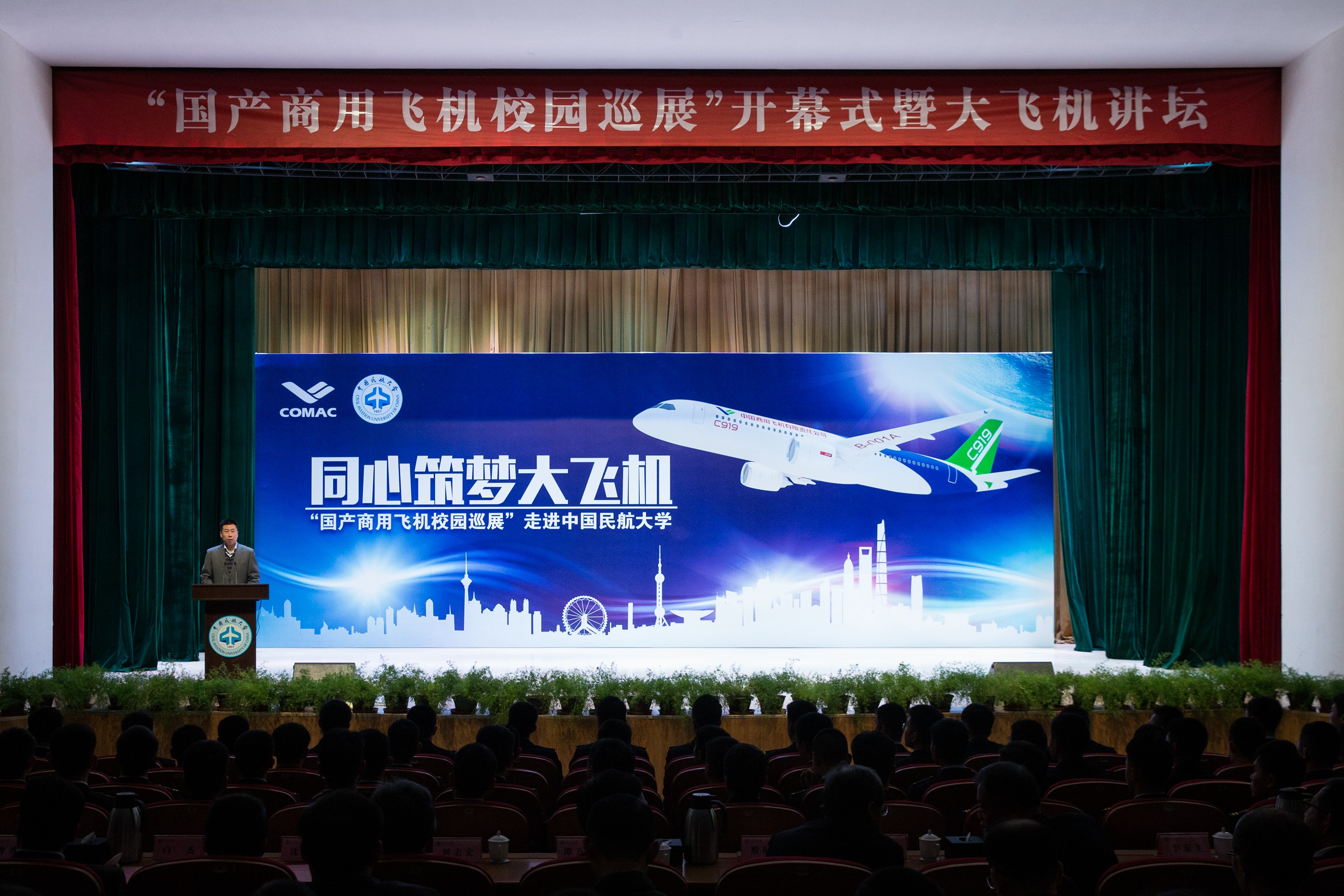 本网讯 11月13日,“同心筑梦大飞机”国产商用飞机校园巡展活动的全国首站、《大飞机讲坛》的第一场在中国民航大学拉开帷幕,民航局总工程师殷时军、人事科教司副司长刘志宏、培训教育处处长邸维光,中国商用飞机有限责任公司党委副书记、董事谭万庚,中国民航大学党委书记曹胜利、副校长白杰,民航天津安全监督管理局党委书记、局长李东生,天津滨海国际机场总经理吕志农,民航华北地区空中交通管理局天津分局党委书记、工会主席栾鹏出席开幕式,中国民航大学党委副书记赵洪海主持仪式。中国商用飞机有限责任公司(以下简称“中国商飞”)、中国民航大学相关单位、部门负责人和学校师生代表参加,700余名师生齐聚北区礼堂,见证“国产商用飞机校园巡展”正式拉开帷幕。