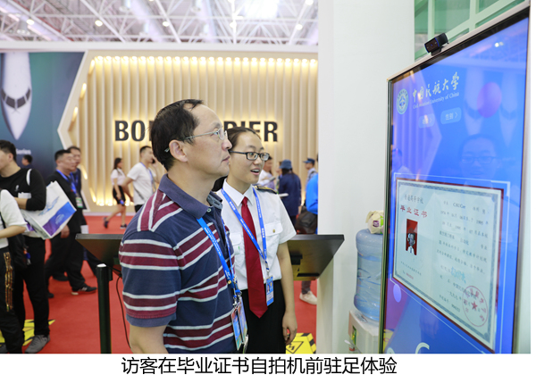 走进展位,LED屏上播放的视频展示出学校人才培养、科学研究、国际交流、文化传承、校园环境建设的成果;展板以图文形式展示中航大在国家改革开放40年来经历的大事件,如学位证和学历证的变迁、专业结构布局的完善、专本硕博的招生简章等;以及中航大在德智体美劳五大方面的育人理念和成果。本次航展,展位新设计了供校友留言和合影的初心亭,并设置了可拍照的自拍机,利用科技让校友充分感受到“家”的温馨。