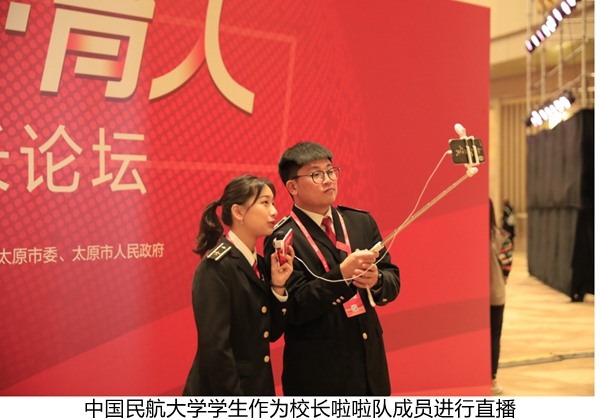 大学生记者团负责人、人文(法)学院2016级学生潘致伊被选为本次啦啦队志愿者,并在此次直播活动中采访中国民航大学校长董健康。董健康在直播中回答了潘致伊在直播中提出的“民航人是如何回归本心、中航大如何通过‘四个课堂’进行育人工作”两个问题并在直播中呼吁中航大学子认真学习,做有信念、有本领、有担当的准民航人。潘致伊说:“采访之前我非常的紧张,第一次近距离采访到董校长,没想到董校长那么的亲切。我也从采访中更加了解到校领导对学生的关怀与期待。”